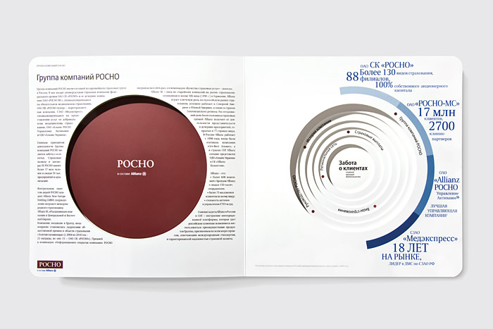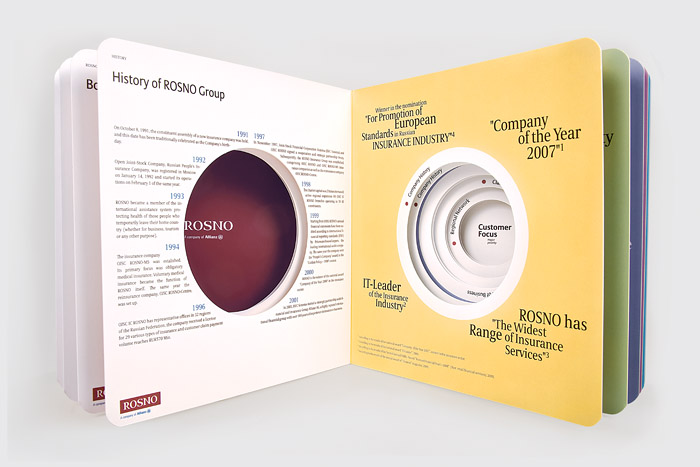 Центростремительный буклет для РОСНОВ основу концепции корпоративного буклета компании РОСНО лег принцип заботы о клиенте. Он нашел образное и буквальное отражение на страницах нового буклета. Как считают в агентстве Deza, дизайнерское решение подкупает своей простотой и наглядностью: только основная информация, которая может быть интересна клиентам и партнерам РОСНО, и чёткие иллюстрации ценностного предложения компании. Подобно планетной системе, которая держится на силе притяжения центра, клиент - центр системы РОСНО, и все "вращается" вокруг него. Конструкция буклета такова, что клиент всегда находится в центре внимания - в центре внимания зрителя и в центре внимания компании. Буклет издан на русском и английском языках. Для желающих получить более развернутую информацию буклет комплектуется CD с годовым отчетом компании.