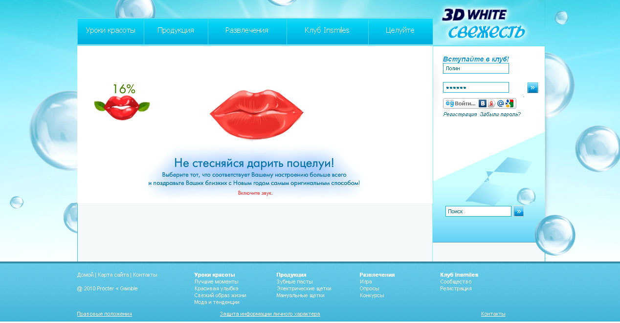 Интерактивный поцелуй Веры Брежневой к Новому годуBlend-a-med в поддержку своей рекламной кампании представляет интерактивное видео, в котором Вера Брежнева, лицо Blend-a-med и Oral-B в России и Украине, поздравит всех с Новым годом, подарив воздушный поцелуй Кампания по продвижению Blend-a-med 3D WHITE Свежесть и Oral-B 3D White Свежесть включает в себя не только стандартные способы коммуникации с потребителем, но и продвижение в интернете, в том числе с помощью вирусного интерактивного видеоролика. В этом видеоролике Вера Брежнева дарит воздушные поцелуи каждому своему поклоннику, и любой посмотревший видео может прислать его друзьям, коллегам и знакомым в качестве флэш-открытки. Сам интерактивный видеоролик, по сути, является роликом-конструктором, где каждый пользователь может скомпоновать поздравление в зависимости от того, кому оно адресовано. В нем предусмотрены несколько вариантов воздушных поцелуев: дружеский, добрый, чувственный, кокетливый и многообещающий. Помимо этого, Вера Брежнева вслух произносит поздравления с Новым годом, и здесь тоже есть несколько опций - поздравление может быть адресовано любимому человеку, другу или коллеге - все зависит лишь от выбора того, кто отправляет открытку. Интерактивный видеоролик с Верой Брежневой от Blend-a-med доступен по адресу |