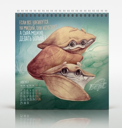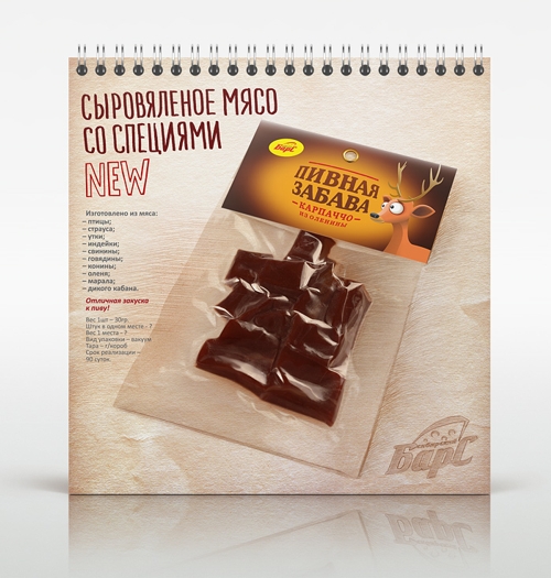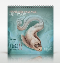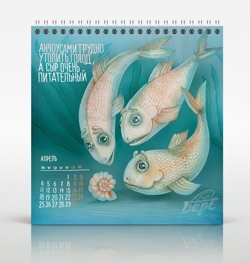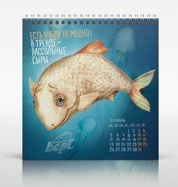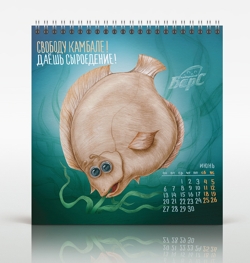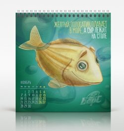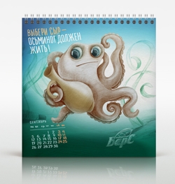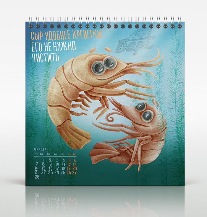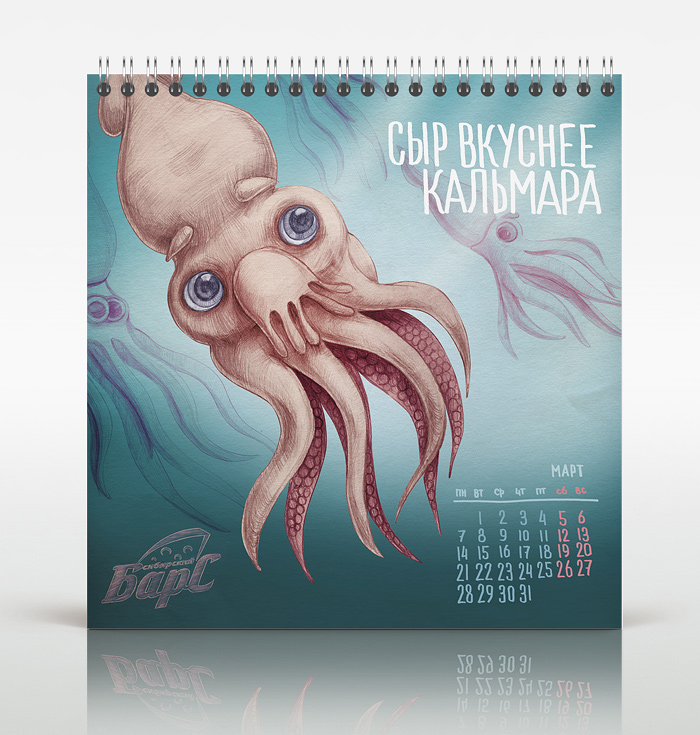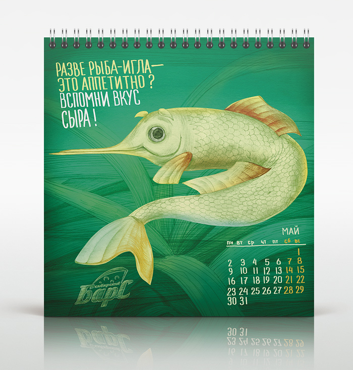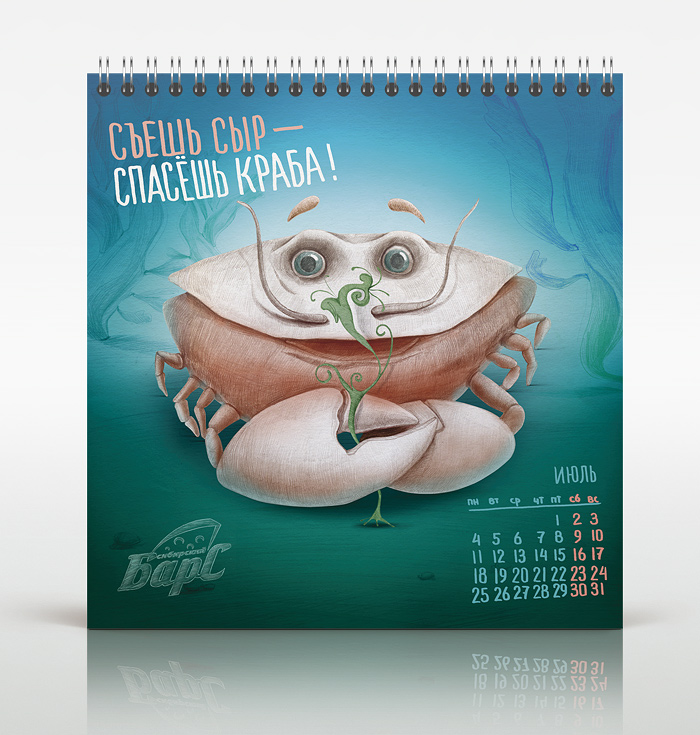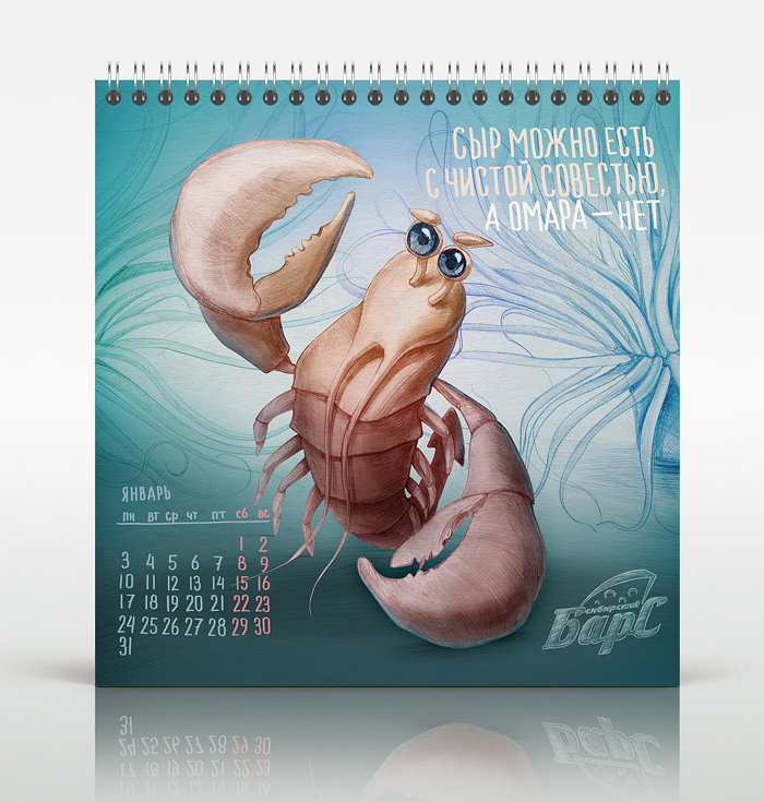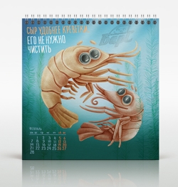 "Сибирский барс" за спасение морской фауныАгентство "Рекламист" разработало настольный календарь для ТД "Сибирский барс" - производителя рассольных сыров. Главная идея календаря выражена слоганом "Сибирский барс - за спасение морской фауны". Двенадцать страниц календаря - это двенадцать морских персонажей, каждый из которых используется в качестве закуски к пиву, тем самым составляя прямую конкуренцию рассольным сырам. Календарь выполнен в технике академического рисунка. Каждая иллюстрация - это авторская работа, созданная на основе ручного рисунка с использованием карандашного штриха. Также в иллюстрациях использованы ручные шрифты, что органично дополняет визуальный образ. На оборотах страниц размещен каталог ТД "Барс", цель которого - показать как можно крупнее и ярче продукт и упаковку. Календарь предназначен для партнеров и дилеров компании.