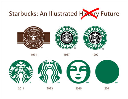 ![]() С сайта starbucks.com Ребрендинг и новый дизайн Starbucks немедленно повлек появление занятной дизайнерской пародии. Бразильский дизайнер Фелипе Торрес изобразил то, как логотип Starbucks может меняться в будущем, причем за основу он взял ту тенденцию упрощения, что имеется и сейчас.