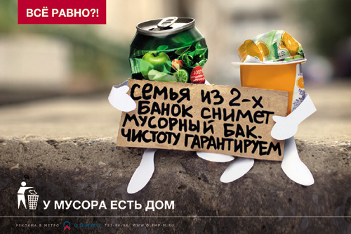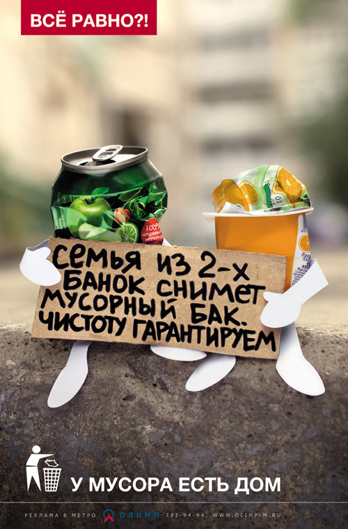 News Outdoor напомнили - у мусора есть домС 29 декабря 2010 года в столичном метрополитене стартует совместная некоммерческая акция компаний "Олимп", News Outdoor и Группы АДВ по привлечению внимания жителей мегаполиса к проблемам экологии, в частности к загрязнению горожанами бытовыми отходами улиц, скверов и других частей нашего прекрасного города. Кампания проходит в рамках социального проекта "Все Равно?!". Кампания пройдет в Москве и в 20 городах России. Будет задействовано более 3000 поверхностей: щиты 6х3, ситиформаты, пиллары, скамейки. Помимо поверхностей наружной рекламы, будут задействованы и рекламные конструкции Московского метрополитена: эскалаторные щиты и роллерные дисплеи.Креативная концепция социальной кампании в защиту окружающей среды от мусора со слоганом «У мусора есть дом» разработана и создана АМК Znamenka. Цель акции - поддержка социальной активности горожан, воспитание ответственности, экологического мировоззрения, бережного отношения и любви к окружающей природе и местам проживания. Управляющий директор News Outdoor Максим Ткачев комментирует: «Новый флайт кампании «Все равно?!» вновь призывает к активной жизненной позиции. Именно от каждого из нас зависит, будет город чистым или грязным. Если каждый из нас донесет мусор до урны, он не только поможет городу, но и одержит маленькую победу над своей ленью и равнодушием». «В рамках этой кампании мы поднимаем очень важную для каждого проблему, - говорит Председатель Совета директоров Группы АДВ Дмитрий Коробков. - Для нас естественно поддерживать порядок в доме, но многие не задумываются о необходимости заботы о природе и чистоте городских улиц. Наш мир катастрофически загрязняется - и это дело рук человека. Мы должны помнить, что сохранение природы зависит только от нас, ведь «У мусора есть дом». Напомним, что в рамках кампании "Все равно?!" прошла скандальная социальная реклама против курения и в поддержку бездомных людей, для них предлагалось собрать одежду.