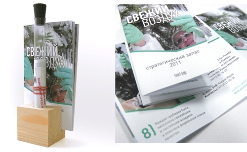 Воздух в подарок от агентства Pavlov's DesignВ студии Pavlov's Design решили, что лучшим подарком после жаркого лета будет глоток свежего воздуха, собранного в зимнем лесу, в одном из самых чистых мест Рязанской области. День для забора воздуха был выбран уникальный, так как 21.12.2010 года стал самым темным днем за последние 400 лет. Вооружившись спецкостюмами, пробирками и фотоаппаратом с фотографом, специалисты студии выдвинулись в поселок Солотча, расположенный в близи Мещерского заповедника. Затем собранный там воздух был размещен по пробиркам и преподнесен в дар клиентам, партнерам и друзьям студии Pavlov's Design. В набор "Стратегический запас свежего воздуха" вошли: пробирка со свежим воздухом, кубик-подставка, буклет-раскладушка с фотоотчетом, инструкция по применению. |