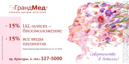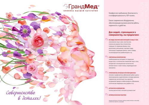 Лицо в цветах от "Икраткого" и клиники "ГрандМед"Рекламное агентство "Икраткое" разработало для клиники "ГрандМед" креативную концепцию, в центре которой - лицо девушки, собранное из лепестков цветов.Как считают дизайнеры, несмотря на свою воздушность, этот образ четко передает естественность и утонченность, которые присущи услугам клиники. Креативная концепция заключается в том, что цветок - это совершенное творение природы, он состоит из мельчайших деталей, единство которых и рождает прекрасный образ. Красота человеческого тела и лица также складывается из малейших нюансов - пропорций, изгибов и черт. Довести их до идеала, создавая совершенство - это и есть задача клиники "ГрандМед". Концепция была адаптирована сразу для нескольких носителей - вклейки в "Желтые страницы", щитов 3х6, лайт-боксов, евро-буклета и модулей в печатные издания. |