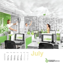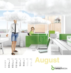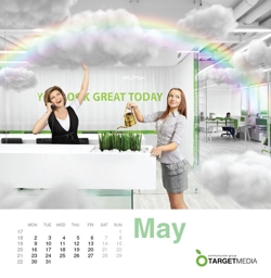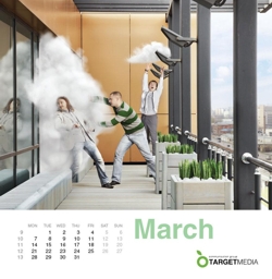 Высокая облачность в корпоративном календаре Target MediaДля корпоративного календаря Target Media выбрали идею "Жизнь с облаками". Ключевой задачей было показать в календаре новый офис компании и сотрудников в нем. Офис агентства построен по проекту архитектурного бюро "Практика". Для создания такого пространства совместно с ProjectNEXT был организован конкурс на лучшую дизайн-концепцию интерьера офиса. Проект победителей был полностью реализован в 2010 году. Как рассказывают в агентстве, эта фотосессия вышла шуткой над московским серым небом. В Москве привычно слышать жалобы на погоду и видеть хмурые серые лица. Но гораздо лучше не обращать внимание на сей факт, строить бизнес, растить детей - тогда совсем не до грусти. Тем более, если на работе ждут облака. Надпись на обложке: One step more, and you're on the 8th floor (Еще 1 шаг, и ты на 8-ом этаже).
