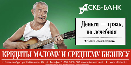 Как только информационный шум вокруг кампании затих, эстафету у очкарика принял ставший в последние годы достаточно популярным и любимым актер Сергей Гармаш ("Обитаемый остров", "Стиляги", "Черная молния", "Край"). Пересказывать всю историю сейчас не имеет смысла - она до сих пор на слуху. Напомним лишь, что актеру якобы не понравились фотоснимки, которые СКБ-банк использовал в рекламной кампании. Гармаша не устроил его образ в майке-алкоголичке. Судебные разбирательства вокруг этого события растянулись на долгие полтора года, и в течение этого времени подарили СКБ-банку постоянную прописку в колонках о селебрити и новостных программах. И, как только стало ясно, что уже пора закругляться, председатель правления банка Владимир Пухов, дабы обелить в глазах общества майку-алкоголичку, сам снялся для кампании своей организации, в том же антураже, что и Гармаш. Тем самым, во-первых, доказав, что в макетах не было ничего обидного. А во-вторых, заставив всех еще раз поставить его на главную страницу. Подробно об этом Sostav.ru писал в ноябре 2010 года.