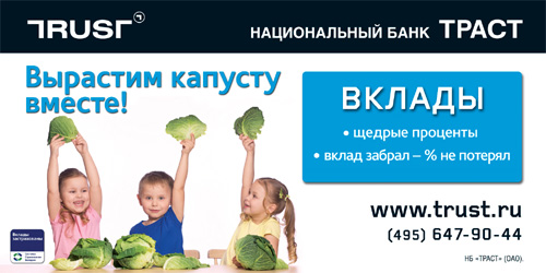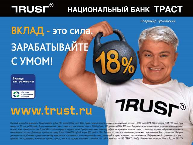 И вот тогда, той же осенью у СКБ-банка появился рекламный оппозиционер - банк "Траст". Незадолго до этого он также прославился кампанией со звездой. Правда, слава эта была куда менее приятной: в качестве селебрити у "Траста" выступал гладиатор Владимир Турчинский. Когда он скончался, кампания была в самом разгаре. Рекламодателю в кратчайшие сроки пришлось демонтировать большое количество поверхностей, на которых размещались макеты с покойным. Впоследствии, они были заменены на изображения с веселыми монстрами.