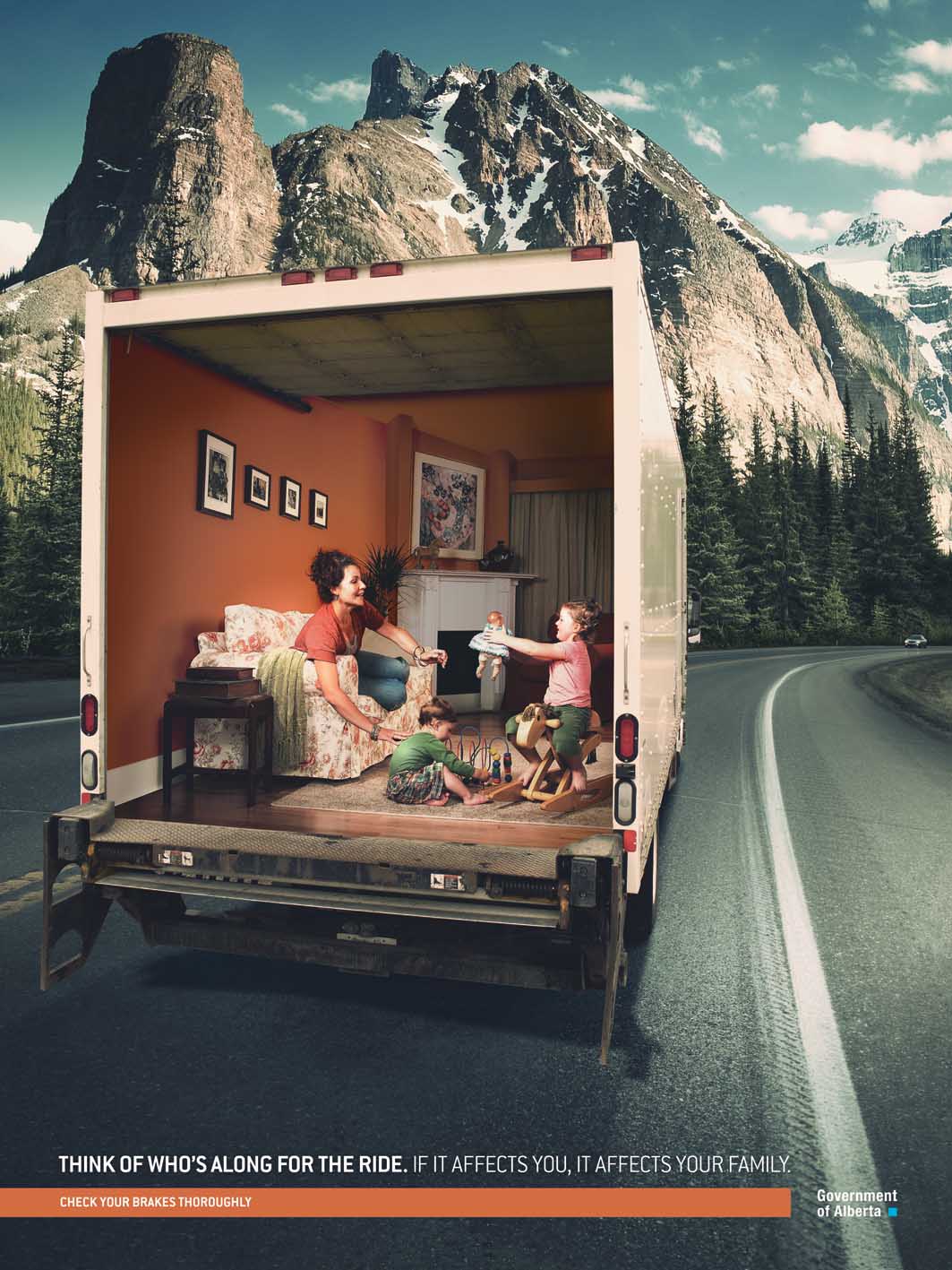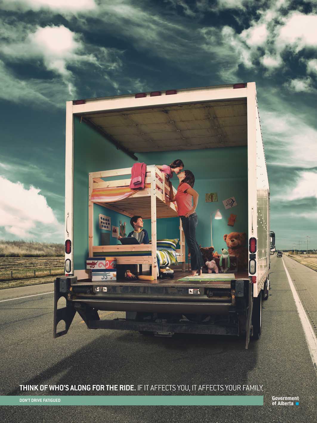 Канадцы учат водителей грузовиков дорожной безопасностиПродолжение пропагандистской кампании Управления безопасности дорожного движения провинции АльбертаАгентство Calder Bateman продолжает выпускать принты, посвященные безопасности на дороге, по заказу правительства канадской провинции Альберта. Недавно креаторы сравнили переход дороги с прогулкой над пропастью по шаткому мостику, а теперь взялись за наставления для водителей грузовиков. Реклама обращается к дальнобойщикам и заставляет их задуматься о том, что их работа довольно опасна и может затрагивать не только их самих, но и их семьи. Принты призывают всегда пристегиваться, проверять тормоза перед поездкой и не садиться за руль усталыми. Состав творческой группы |