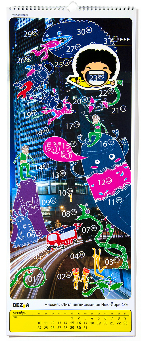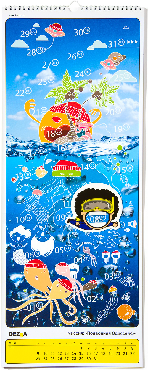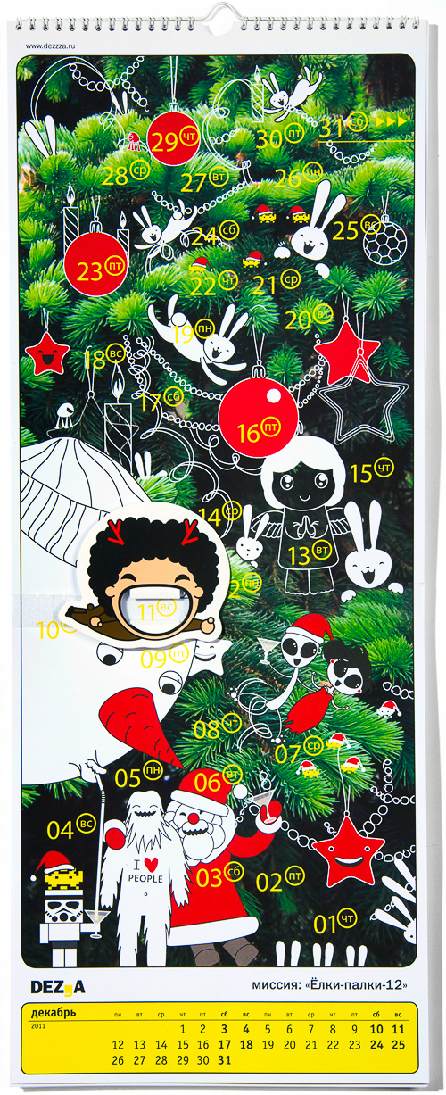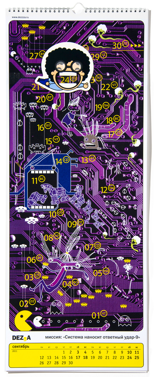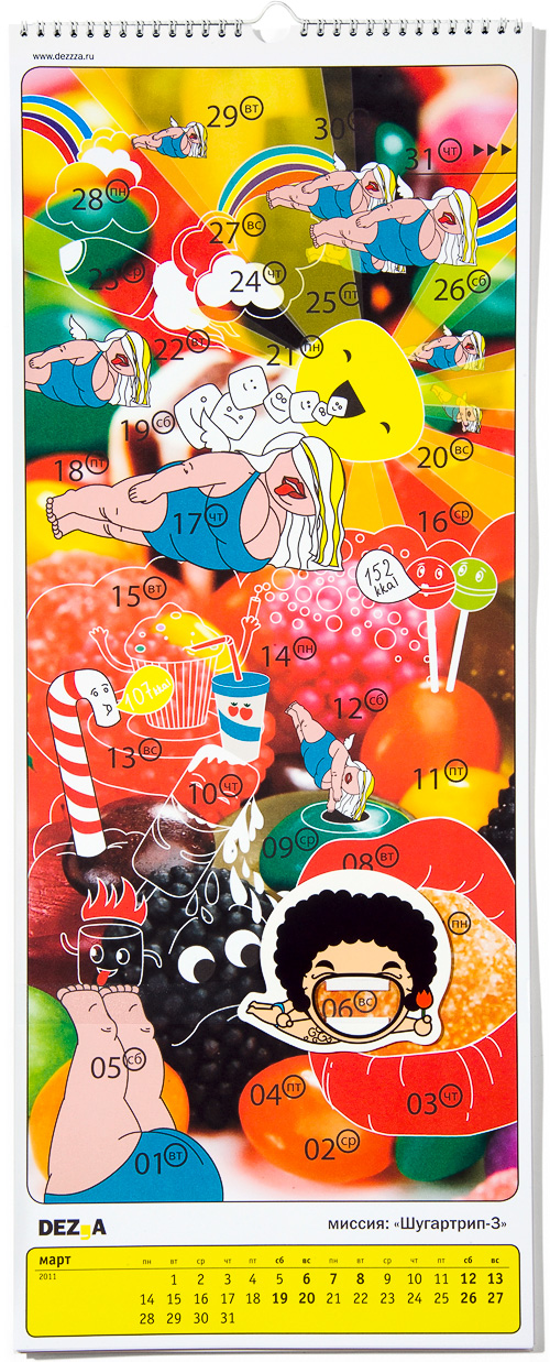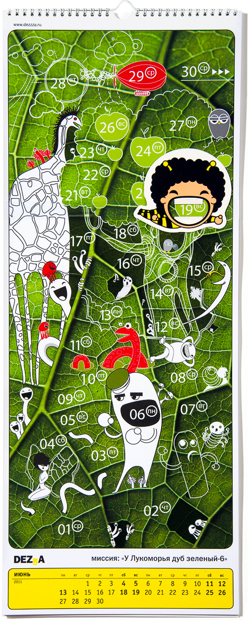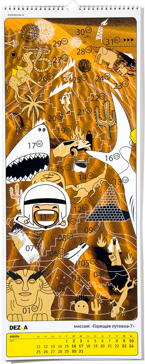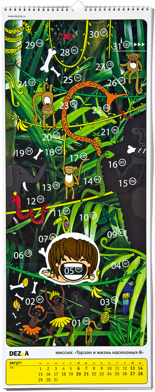 DEZA организовала игры в календарьВ это раз, создавая свой календарь, Студия DEZA решила выступить в легком жанре и совместить календарь с игрой. Механика использования любого календаря в повседневном режиме - это последовательное перемещение от текущего числа (дня) к следующему. Чтобы отметить сегодняшнее число, часто используется бегунок. Соответственно, в течение месяца происходит ряд перемещений бегунка от одной точки к другой. Вспомним всегда популярные игры-бродилки. Вы, управляя персонажем, перемещаетесь от одной точки к другой, от этапа к этапу, собирая бонусы, радуетесь и гордитесь собой, проходя очередную миссию. А теперь пусть каждый месяц в календаре станет миссией в игре, а перемещение от одного дня календаря к другому с помощью бегунка собственно "прохождением миссии". Механику использования календаря мы превратили в увлекательную игру со смыслом: "Вся наша жизнь - игра" на легкий и позитивный лад. Итак, в распоряжении игрока 12 миссий и главный герой, который видоизменяется для прохождения соответствующей миссии (в комплекте календаря 12 сменных персонажей-бегунков). Для полноты ощущений на каждом листе рекомендуется разглядывать детали. В нашей жизни мы движемся по году шаг за шагом, день за днем и не можем изменить этот порядок. НO - именно в наших силах сделать это путешествие увлекательным, приятным, интересными, азартным. Собственно этого всем и желаем! Состав творческой группы