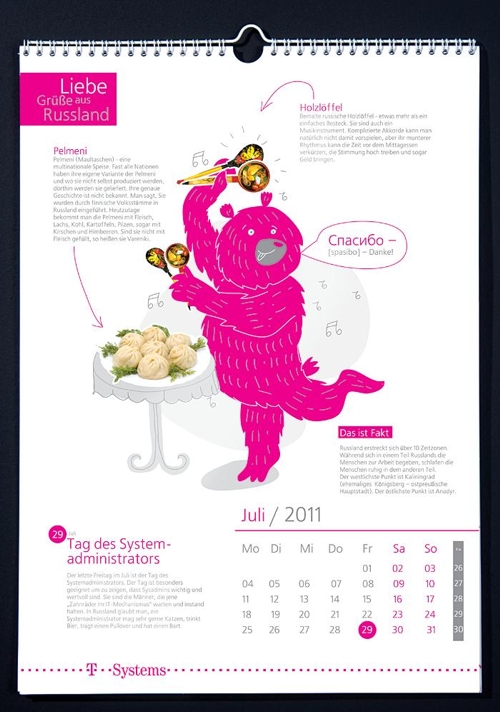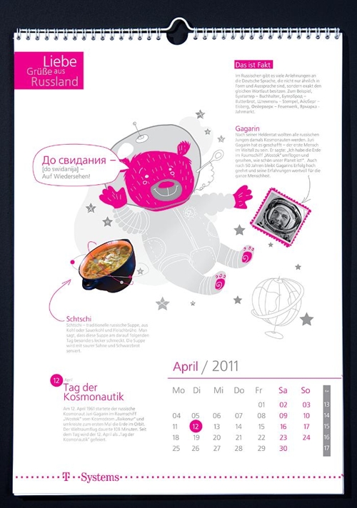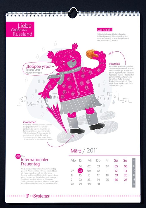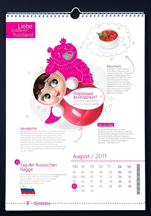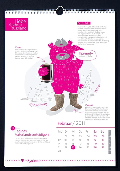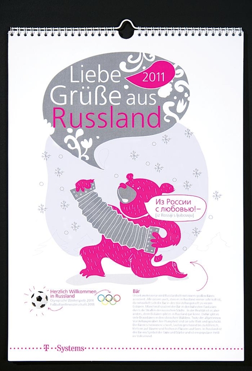 "Из России с любовью"Студия DEZA разработала календарь для компании T-SystemsКомпания T-Systems поставила задачу разработать календарь для партнеров в Германии. Главной концепцией календаря стал рассказ иностранцам о России под заглавием «из России с любовью».Европейские коллеги узнали и про Чебурашку, и про валенки, про пельмени, гармошку, Гагарина, галоши, щи, пирожки, Москву, Питер, 8 марта, День Космонавтики, как по-русски будет "Привет!", зачем селедке шуба и что делать с неваляшкой. Перед студией поначалу встала непростая задача - уместить всё в один календарь. Но главный персонаж - русский мишка - в свойственной ему непринужденной манере успешно справился с поставленной задачей, подробно и в красках рассказав и показав, самые разнообразные интересы многогранной и широкой российской души.