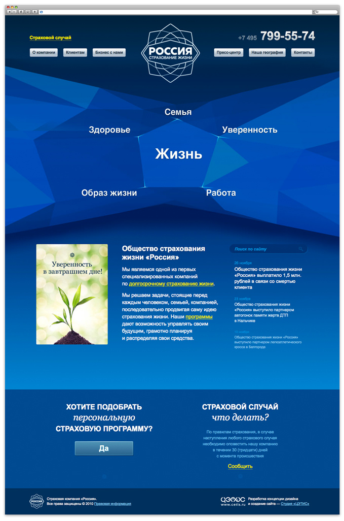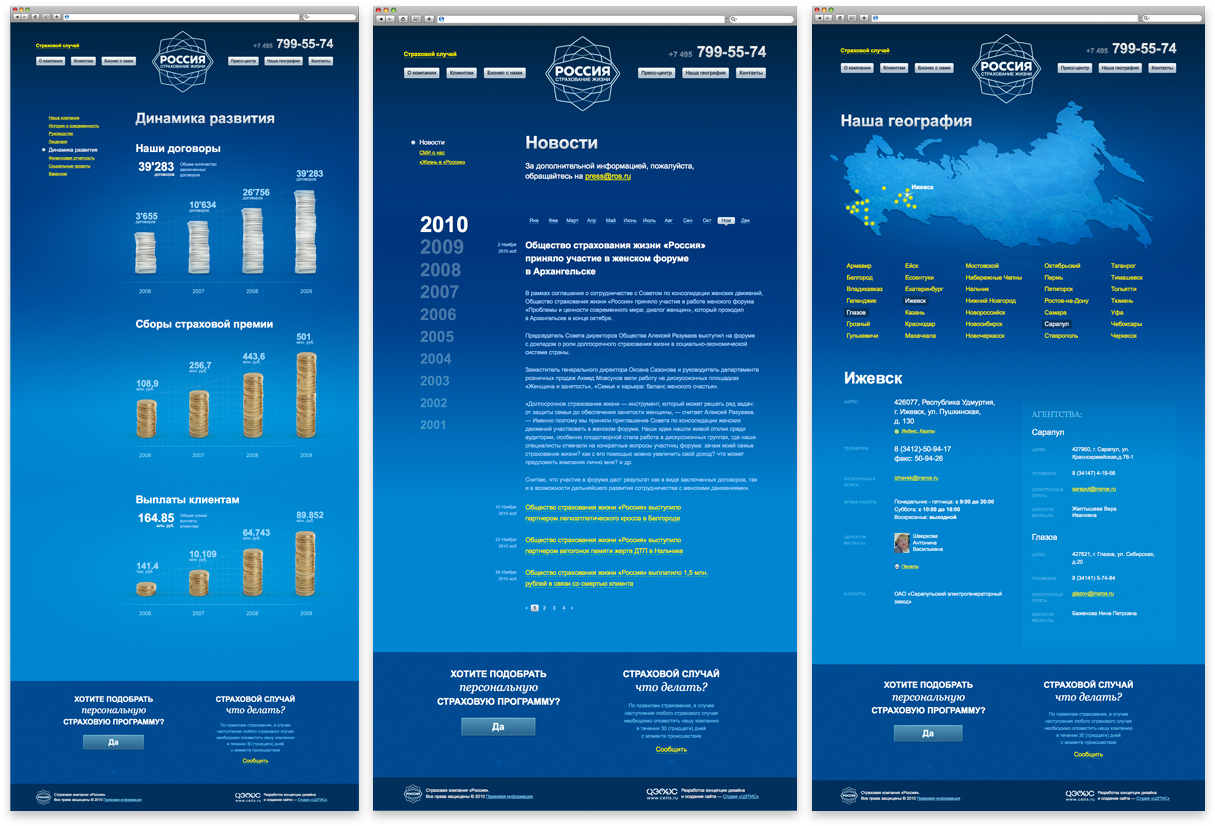 В рамках проекта студией был сперва был проведён анализ отечественного рынка страхования. Его результаты показали, что для увеличения присутствия компании на рынке требовалось расширить восприятие бренда целевой аудиторией и сместить акцент коммуникаций в сторону более молодого сегмента в возрасте 25-30 лет. Крайне важным при этом было сохранить преемственность и узнаваемость бренда, имеющего богатейшую историю и являющегося продолжателем традиций лидера дореволюционного рынка страховых услуг с одноименным названием. Лейтмотивом проекта стала многогранность жизни - наивысшей ценности, которая должна быть надёжно и прочно защищена. Грани символизируют всё то, что наполняет жизнь смыслом. Фирменный стиль полностью интегрирован в жизнь и бизнес-процессы компании. Образ многогранности встречает клиента "России" в офисе компании и отражается во множестве корпоративных материалов, являясь системообразующим элементом бренда. Правила использования фирменного стиля полностью изложены в подготовленном студией гайдлайне. Состав творческой группы:Креативный директор: Якушев Евгений Арт-директор: Антюхов Тарас Арт-директор: Садовский Евгений Дизайнеры: Биктимиров Денис, Быков Дмитрий, Козлова Ольга, Убайдуллаев Сергей Копирайтер: Дементьев Дмитрий Технический дизайн: Матюшина Алина Верстка: Копосов Олег Веб-технолог: Соболев Иван Флеш-технологи: Макаренко Евгений, Сенчурин Николай Менеджер проекта ОСЖ "Россия": Ямщикова Елена |