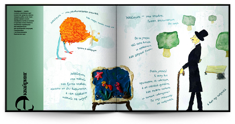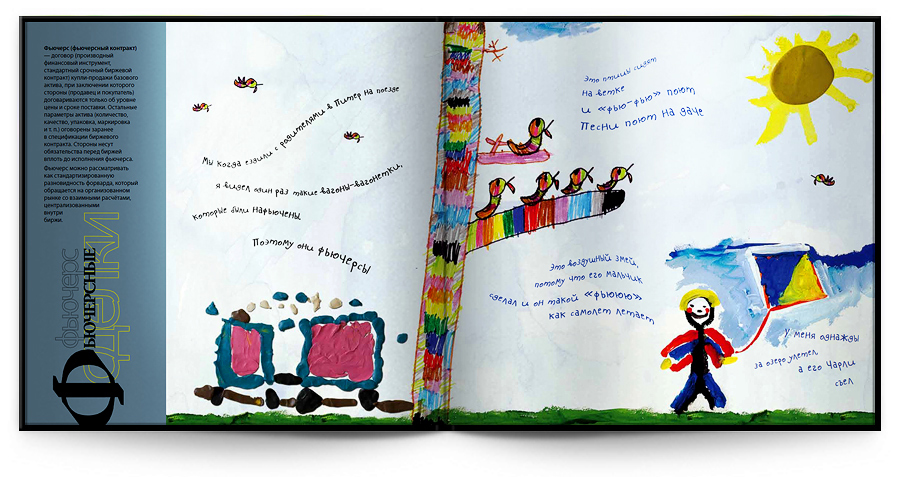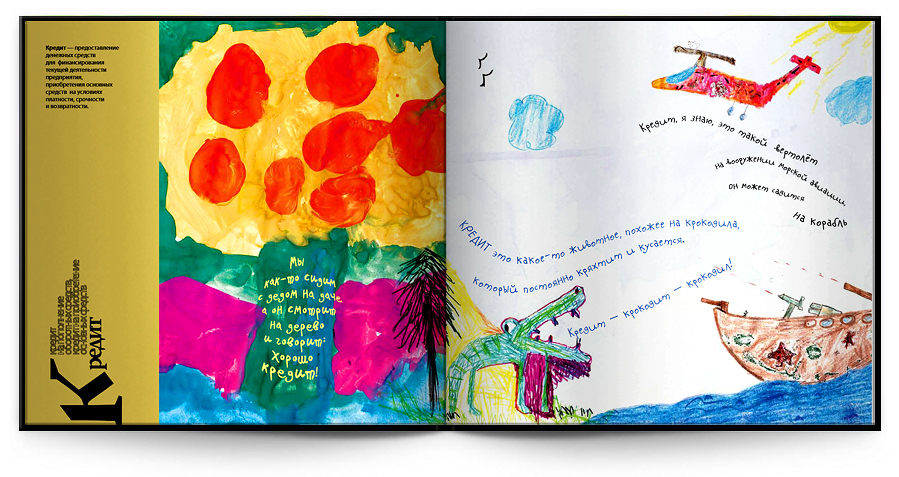 R&I придумали для HOMOC-Банка супермена Овернайта и рыцаря ОпционаРекламный холдинг R&I реализовал новый проект для НОМОС-Банка. 4577 компаний-клиентов банка получили подарок - банковский глоссарий, составленный детьмиНа первом же развороте этого необычного "детско-финансового" словаря, каждый из получателей видел следующее послание: "Привет! Мы с Вами уже давно выросли, приобрели знания, связи, поднялись по социальной и карьерной лестнице. Стали совсеееем большие! Но иногда кажется, что во всей этой взрослой жизни мы кое-что потеряли. Посмотрите на детей, как они весело хохочут и заразительно улыбаются. Вы скажете, это, потому что у них нет проблем, нет забот и ответственности? Соглашусь, но при этом напомню, что это великое мастерство сохранить в себе ребёнка, детскую непосредственность и свежий взгляд на жизнь:" Вступительные строки принадлежат Заместителю Президента банка, руководителю НОМОС-Банка, который представлен здесь крайне необычно - в роскошной розовой шляпе и со связкой забавных воздушных шаров. Открывая, разворот за разворотом глоссария, можно увидеть, как известные банковские термины проходят строгую и бескомпромиссную проверку детским сознанием. Вот как выглядит в "переводе" на язык детских фантазий термин ОВЕРДРАФТ: На заднем плане - разрушенная крепость, пылающая огнем. На переднем плане страшный черный рыцарь Овердрафт и поверженный защитник крепости в крови. Детский комментарий : "Есть такая игра под названием Варкрафт. Там всех всегда захватывают и убивают. А Овердрафт - это, наверно, брат Варкрафта. Такой же беспощадный".
