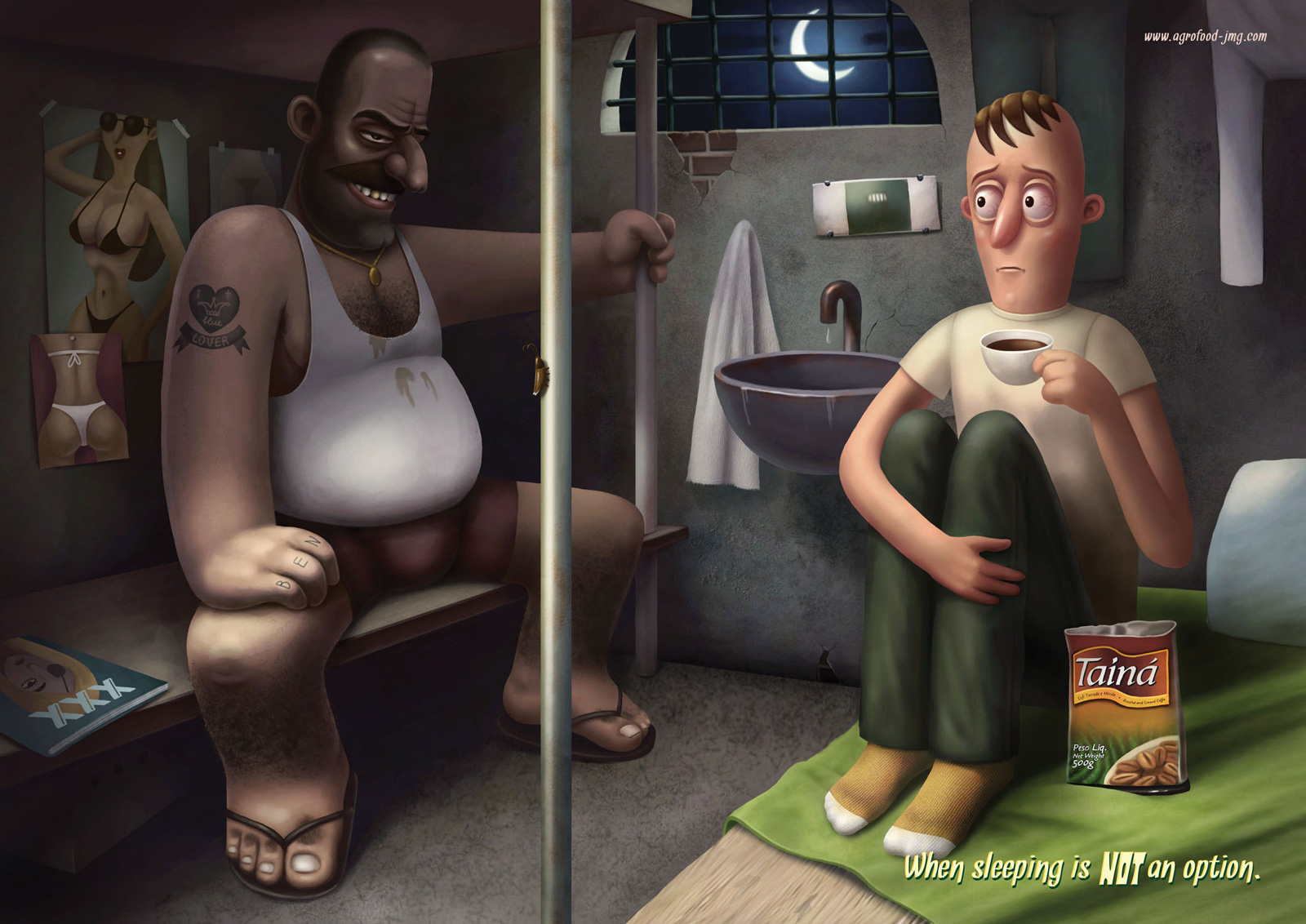 Кофе Taina спасет от губительного снаЮмористическая реклама для бразильского агентства нарисована российским иллюстратором Андреем ГордеевымАгентство Giovanni+Draft FCB из Сан-Паулу выпустило кампанию для кофе Taina. Принты приводят несколько ситуаций, в которых людям крайне нежелательно засыпать. В одном случае сон может привести к особо сильному вниманию со стороны любвеобильного сокамерника, а в другом и вовсе к смерти на необитаемом острове от рук товарища по несчастью. Слоган этой веселой кампании "Когда сон - это не вариант".
