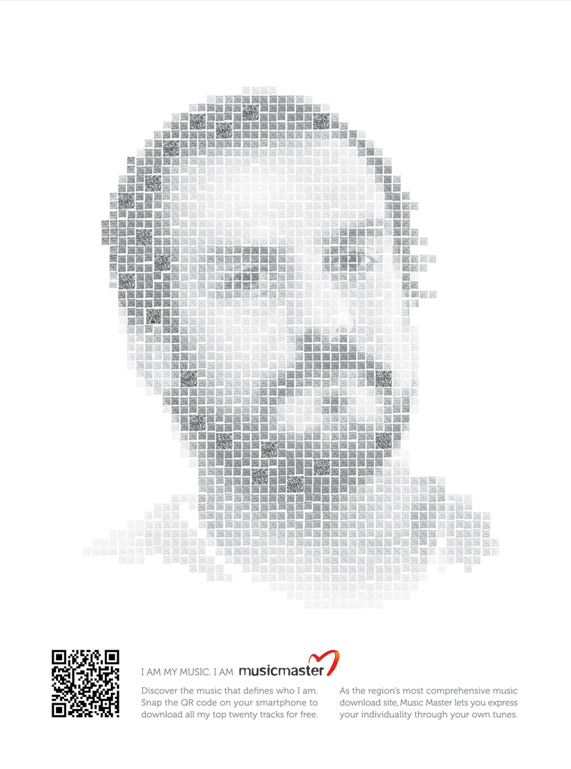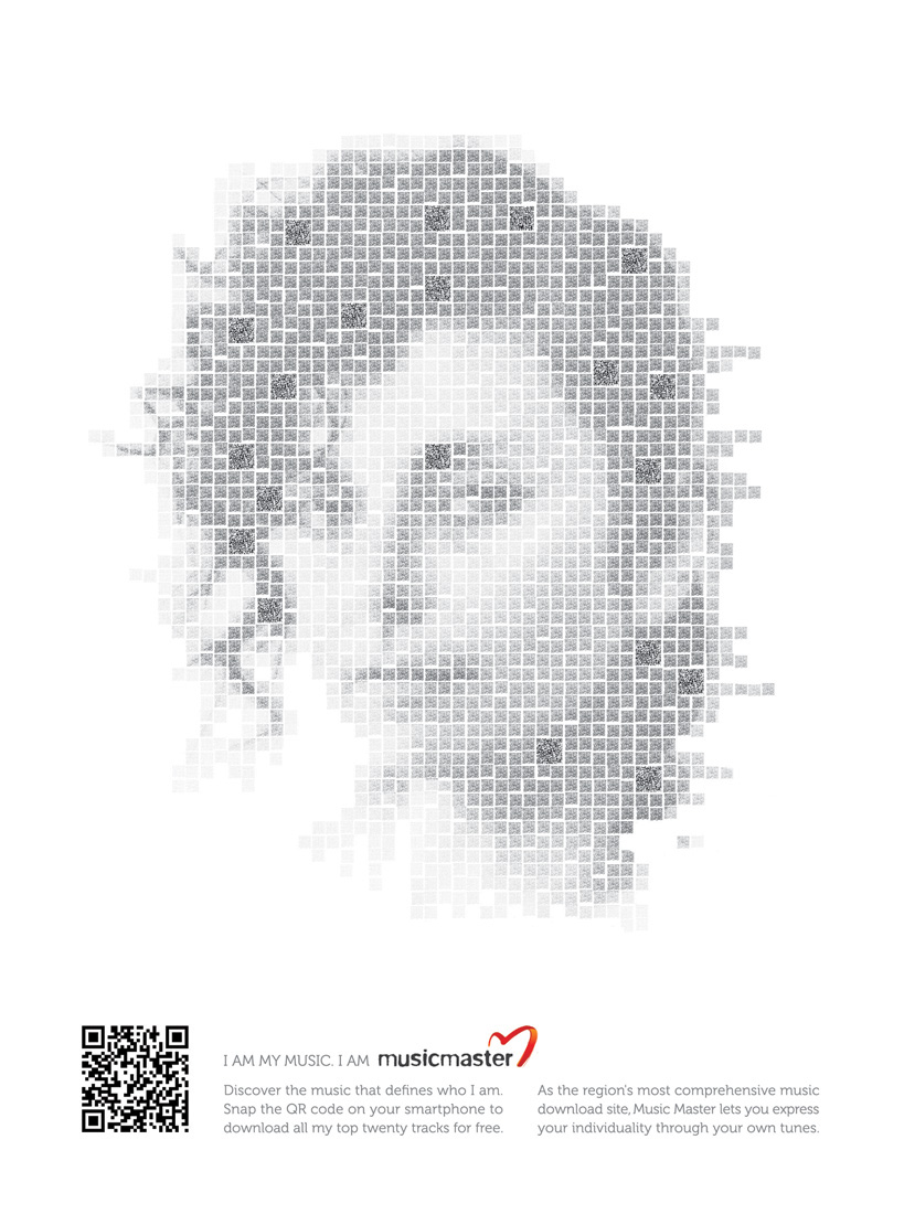 Печатная реклама, позволяющая скачивать MP3Интегрированная рекламная кампания сайта Music MasterНа прошлой неделе в Дубае началась кампания по продвижению сайта MusicMaster, на котором пользователи за деньги могут скачивать различную музыку. Для привлечения внимания к проекту агентствоDDBDubai создало несколько принтов с использованием QR-кодов, которые позволяют скачать несколько десятков мелодий бесплатно. При этом из этих кодов "собрали" лица известных музыкантов. Принты разместили в различных универмагах города, чтобы привлечь как можно больше пользователей. Кроме того возможность скачать бесплатную музыку доступна через страницу сайта на Facebook. Состав творческой группы