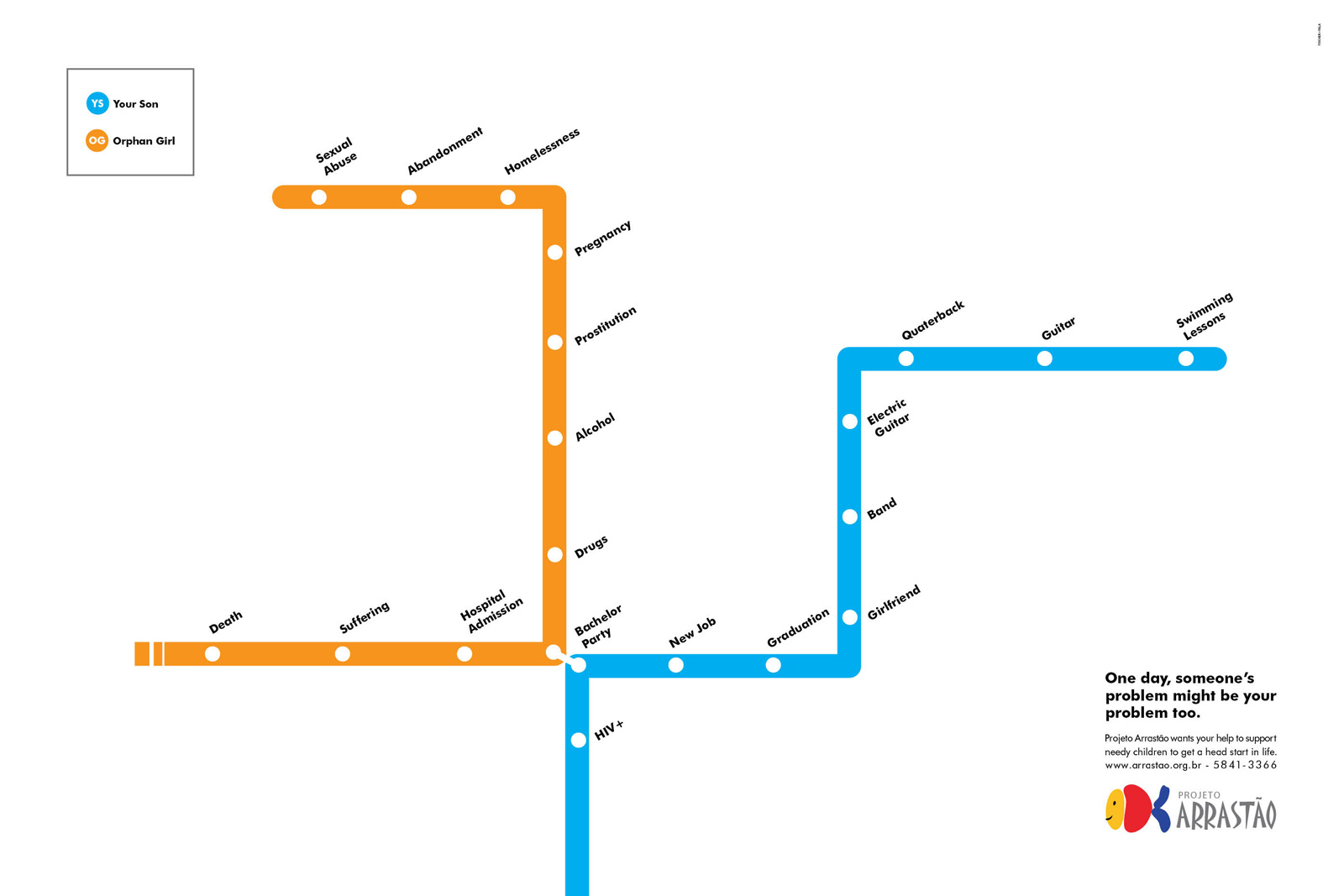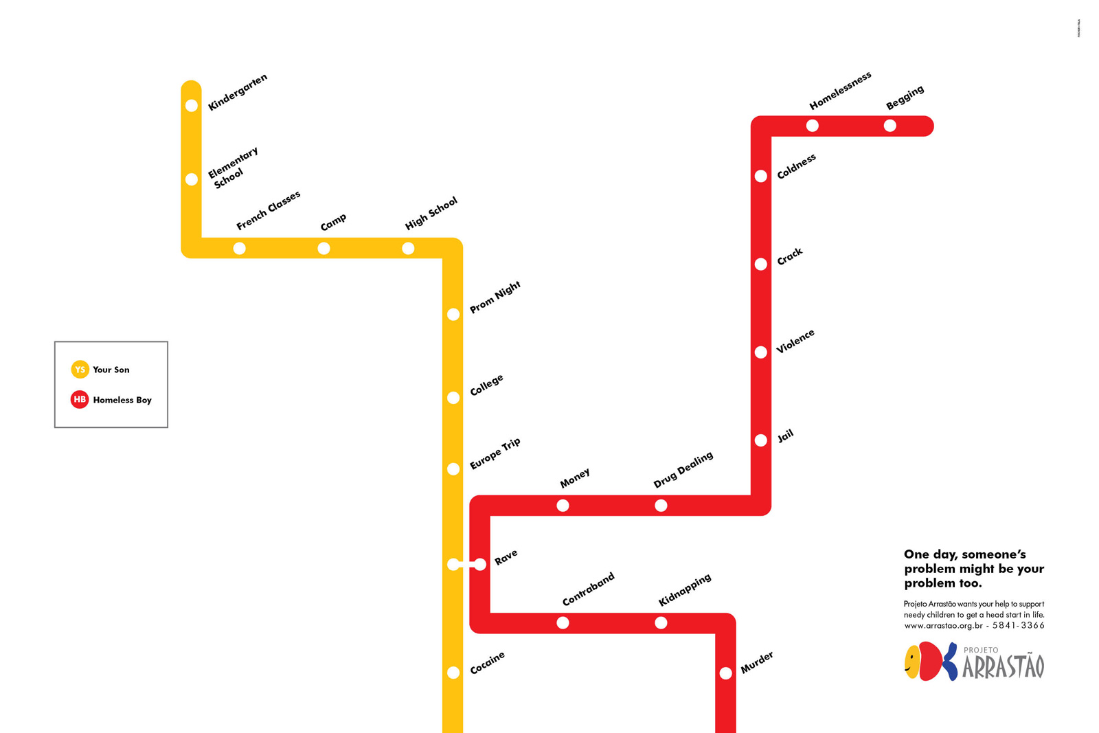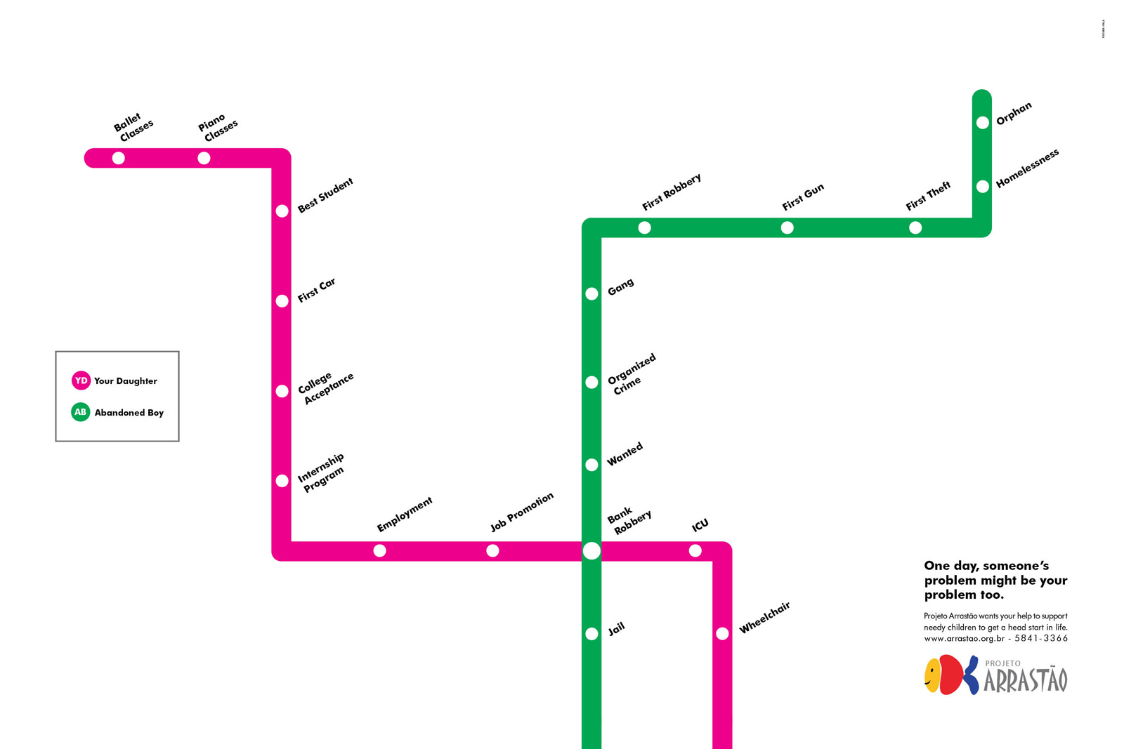 Projeto Arrastão предупреждает о превратностях судьбыРеклама фонда поддержки нуждающихся детей указывает, что игнорирование их проблем может привести к непоправимым последствиямБразильское агентство Fischer+Fala! Выпустило несколько интересных принтов для рекламы фонда помощи нуждающимся детям Projeto Arrastão. Чтобы показать людям, что нельзя игнорировать нуждающихся, и призвать их к содействию, креаторы изобразили две лини жизни, которые однажды пересекаются, приводя к непоправимым последствиям. Одна - это некий нищий или бездомный ребенок, а другая - сын или дочь тех, кто видит рекламу. И так получается, что из-за одной случайной встречи того, чья жизнь разрушена изначально, под откос идет и жизнь благополучного ребенка из-за наркотиков, ВИЧ или же травмы при ограблении. "Однажды чья-то проблема может стать вашей", - сообщает реклама и призывает помочь нуждающимся поддержкой Projeto Arrastão.