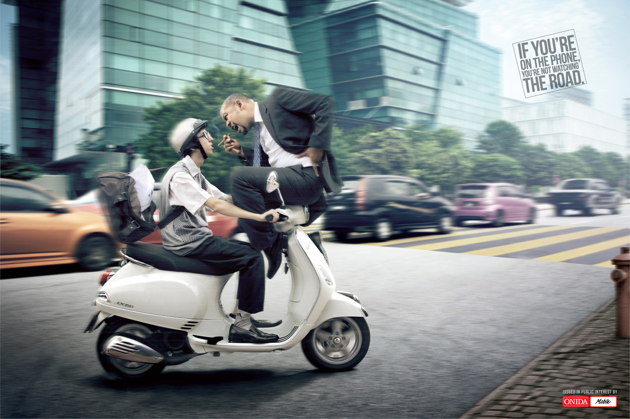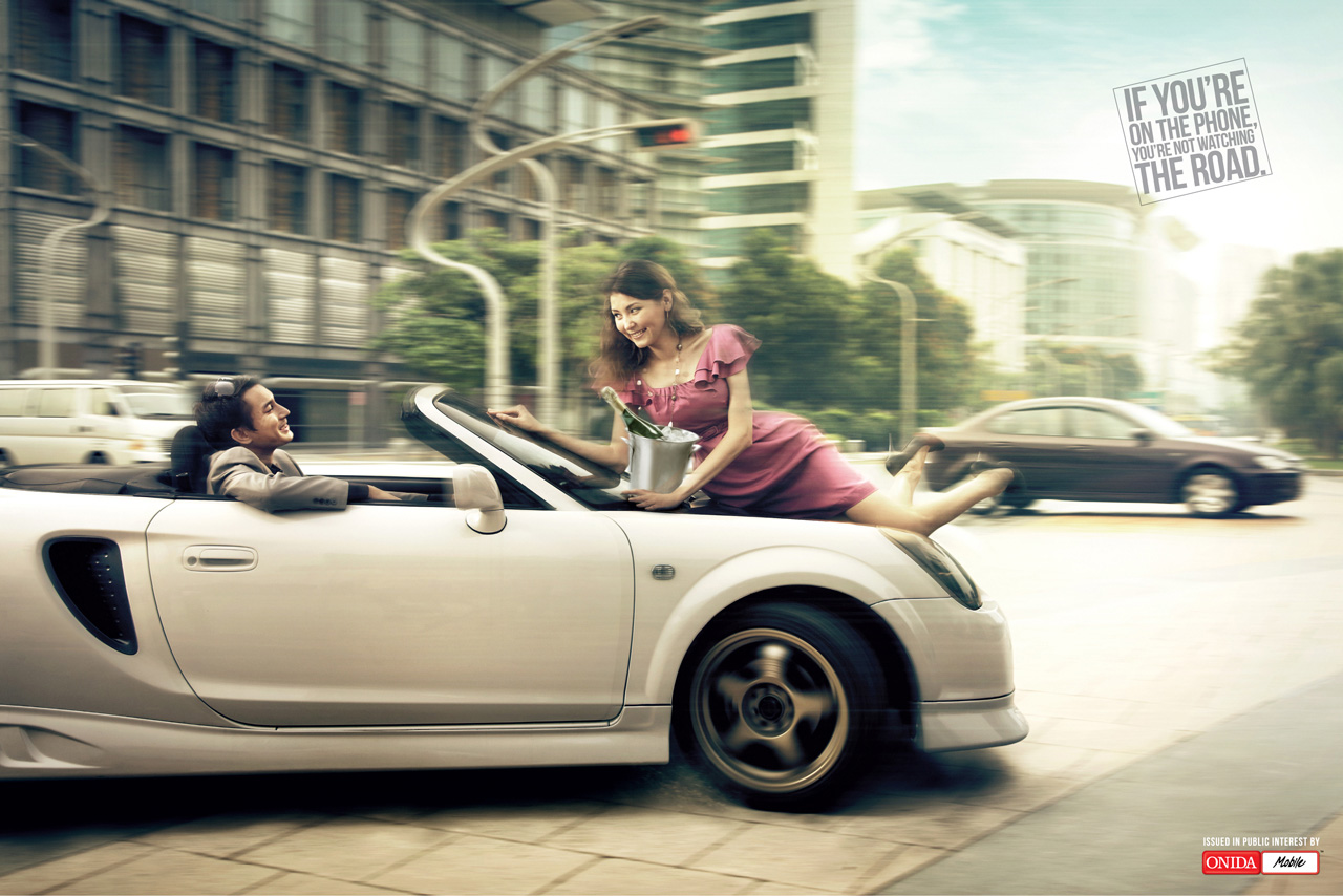 Onida Mobiles просит не звонить за рулемСоциальная компания от индийского мобильного оператораТелекоммуникационные компания нередко выпускают социальную рекламу с призывом не пользоваться мобильными телефонами, управляя транспортным средством. Особенно это касается тех стран, где аварии из-за этого случаются постоянно. Новая реклама индийского оператора связи Onida Mobiles из этой серии. Агентство McCann Mumbai выпустило серию принтов на которых творчески изобразило телефонный разговор водителя - его собеседник оказывается буквально перед ним, мешая управлению авто или мотоцикла. Что, скорее всего, приведет к столкновению. Слоган кампании "Если вы говорите по телефону, вы не видите дорогу". Состав творческой группы
