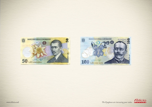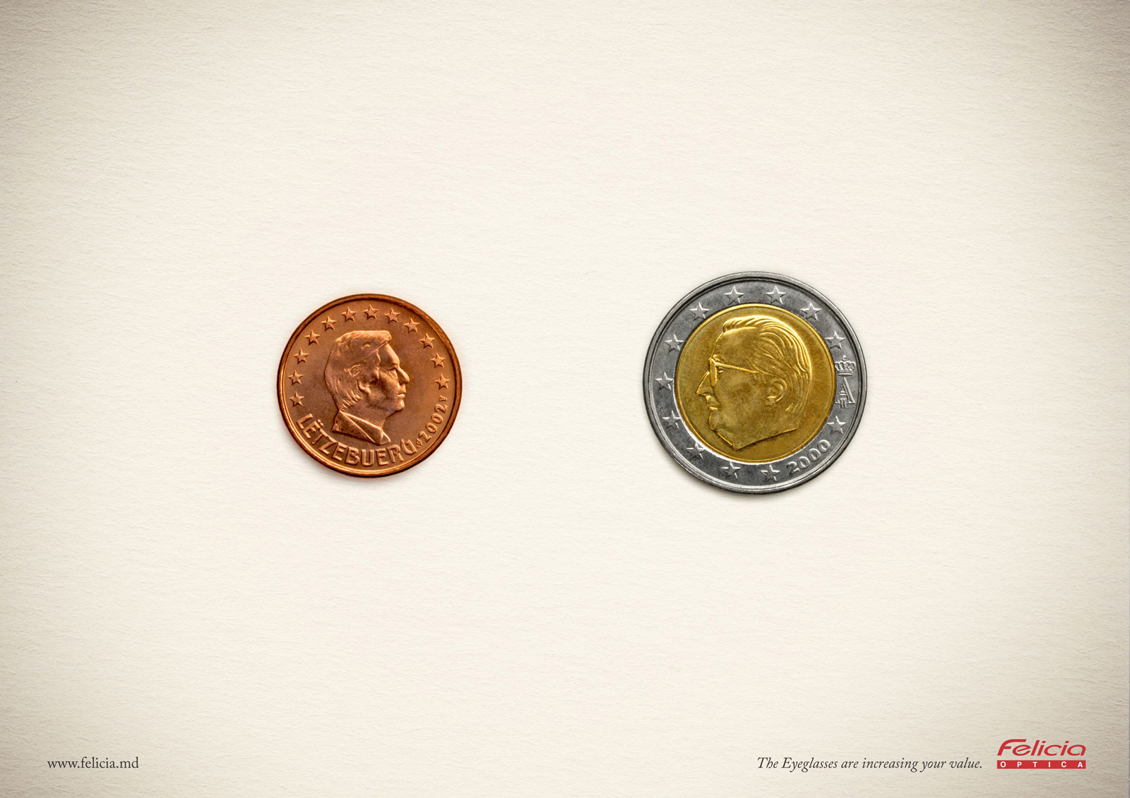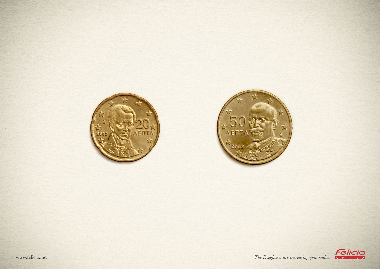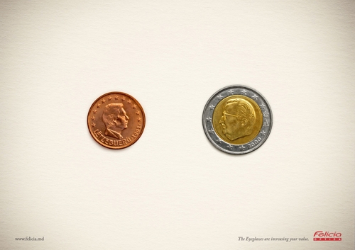 Очки увеличивают ценность денегСалон оптики Felicia Optica продвигается с помощью игры словМолдавское рекламное агентство Piko сделало интересную кампанию для салона оптики Felicia Optica. Реклама сделана очень тонко и имеет двоякий смысл, основанный на игре слов. Принты изображают купюры и монеты разного достоинства, а слоган подчеркивает, что очки увеличивают ценность денег. Понятно, что тут имеется в виду то, что при плохом зрении можно запросто перепутать монеты или расплатиться не той купюрой. Но при этом слоган можно понять и как то, что очки увеличивают достоинство того, кто их носит, а в качестве примера приведены различные политические деятели, носившие очки и попавшие на деньги большего достоинства.