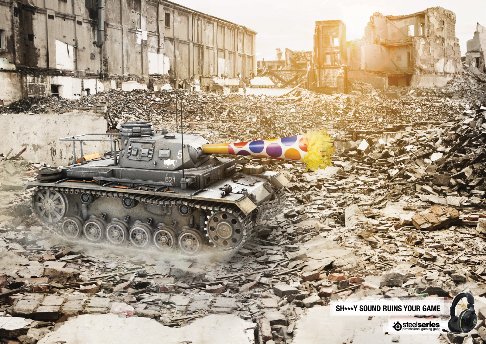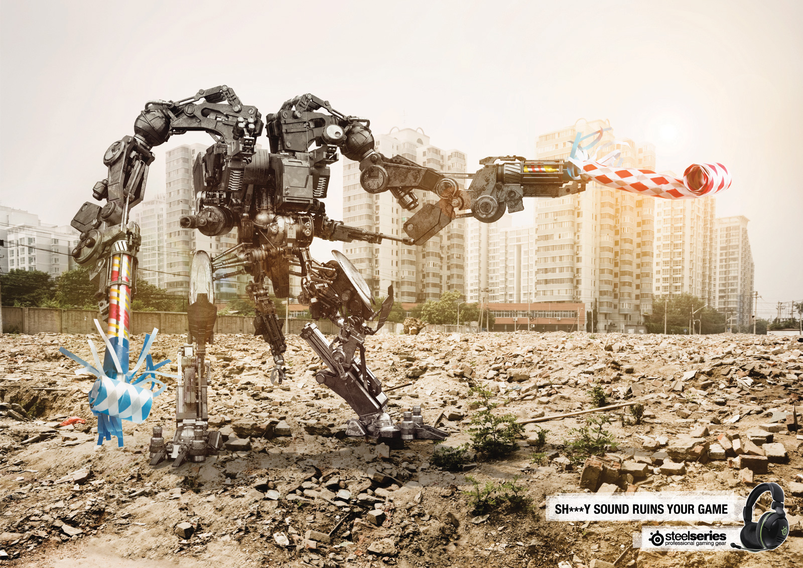 Плохой звук портит всю радость от игрыРеклама геймерских наушников Steel SeriesДатское BBDO выпустило печатную кампанию для бренда техники Steel Series, созданной специально для поклонников компьютерных игр. Реклама посвящена наушникам, которые позволят игроку получить максимум удовольствия от виртуальных баталий. Чтобы подчеркнуть важность хорошего звука, креаторы наглядно изобразили, как плохое звучание может испортить впечатление от игры. Рекламисты сумели изобразить звук, используя для этого образы шутих и хлопушек, которые заменили собой оружие гигантских роботов или танковую пушку. Слоган кампании можно перевести как "Отстойный звук разрушает вашу игру". Состав творческой группы |