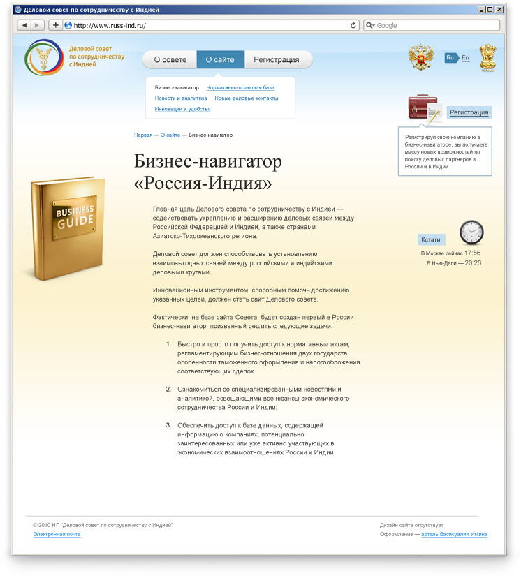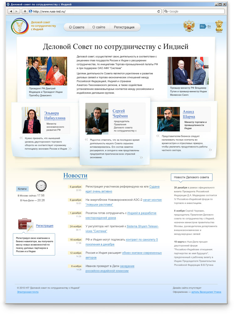 Деловой совет по сотрудничеству с Индией получил временный сайтАртель Васисуалия Уткина, реализует проект по созданию нового портала для Делового совета по сотрудничеству с Индией. Работы по проекту будут длиться несколько месяцев, поэтому на первом этапе была открыта временная версия сайта www.russ-ind.ruДеловой совет создан по инициативе Торгово-промышленной палаты РФ и при поддержке ОАО АФК "Система". Главная цель Делового совета - помогать бизнесменам находить новые деловые контакты как в России, так и в Индии. Чем больше новых контактов, тем больше новых сделок, тем выше прибыль у владельцев компаний, и тем больше товарооборот между двумя государствами. Приступив к работам по созданию портала Делового совета, артель Уткина первым делом открыла временную версию сайта на двух языках - русском и английском. Временный сайт повествует посетителям о серьезности организации и уровне поддержки ее деятельности во властных структурах, а также доступно разъясняет, зачем нужен Деловой совет и какая от него польза. Уже сейчас на сайте можно пройти процедуру регистрации в качестве участника Совета. Деловой совет по сотрудничеству с Индией стал первой в своем роде общественной организацией, которая решила создать собственную социальную сеть, изначально ориентированную на бизнесменов и топ-менеджеров российских и индийских компаний. Когда основной сайт будет готов, каждый участник Делового совета сможет получить неограниченный доступ не только к ценнейшим новым деловым контактам, но и к обширной базе нормативных, новостных и аналитических материалов, относящихся к сфере российско-индийского сотрудничества. |