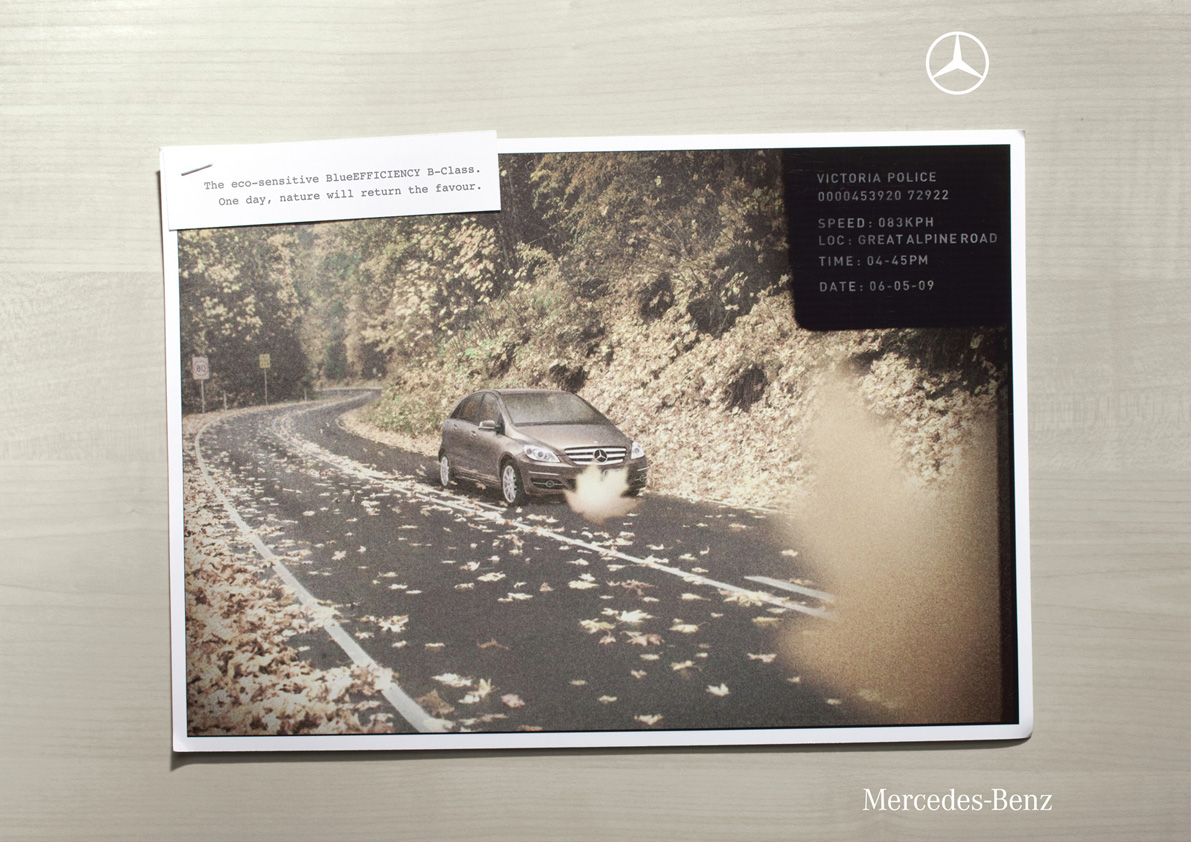 Природа спасет водителей Mercedes-Benz от штрафовНовая кампания автоконцерна подчеркивает его заботу об экологииСингапурское BBDOвыпустило серию принтов для Mercedes, которые не столько рекламируют автомобили концерна, сколько сообщает о технологии BlueEFFICIENCY, благодаря которой они более экологичны. Кампания построена на том, что люди на востоке зачастую воспринимают мир через призму кармы - любое действие со временем влечет за собой ответное действие со стороны других людей или мира. Реклама подчеркивает, что бережное отношение к природе приведет к тому, что однажды и природа окажет вам услугу. В качестве примера показаны фото с камер дорожной полиции в разных уголках мира, которые фиксируют автомобили, превысившие допустимую скорость - благодаря природе, номера машин оказываются, скрыты от глаз полицейских. Состав творческой группы
