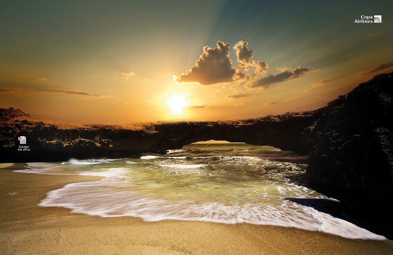 Copa Airlines поможет сбежать из офисаРеклама авиакомпании настраивает на мысли об отпускеКолумбийская авиакомпания Copaи агентство Lowe/SSP3 выпустили рекламу, которая явно направлена на то, чтобы саботировать деятельность офисных работников. Реклама явно призывает людей сбежать с работы и отправиться в отпуск, чтоб наслаждаться дивными видами экзотических стран. При этом на принтах изображены не просто виды прекрасных для отдыха мест - они поданы как рабочий стол компьютера, на котором есть только один единственный файл - план побега из офиса. Состав творческой группы |