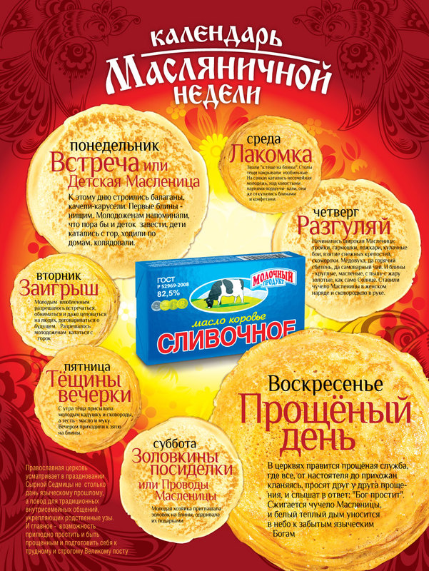 Сейчас в столичном метрополитене проходит кампания для бренда масла "Сливочное". Макет, размещенный в ее рамках, удивляет не только тем, что в него поместилось расписание всей масленичной недели, но и большим количеством ошибок.