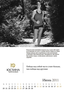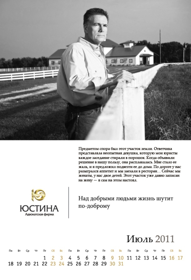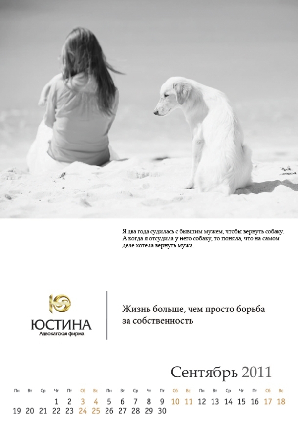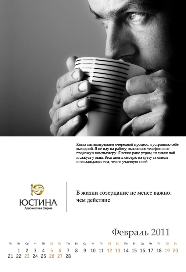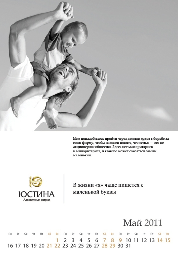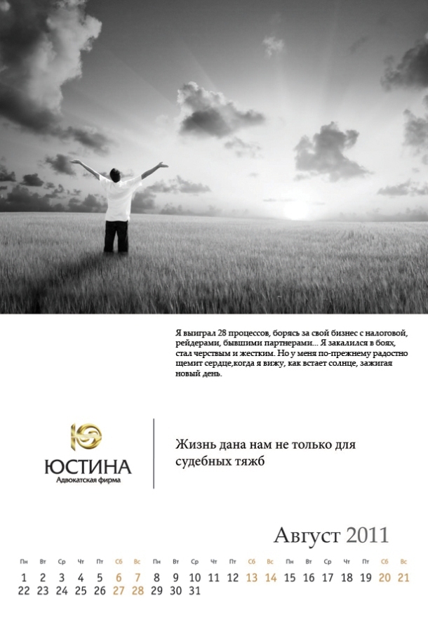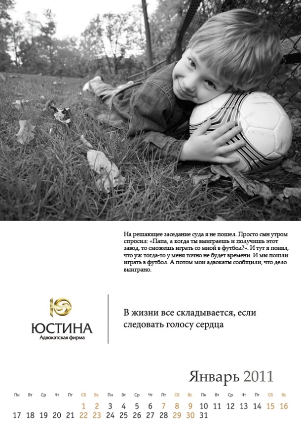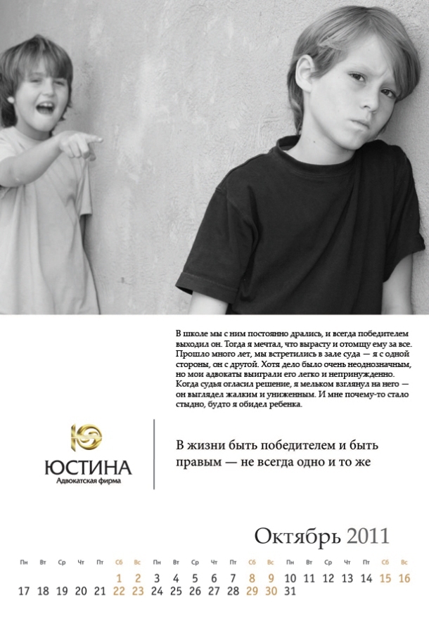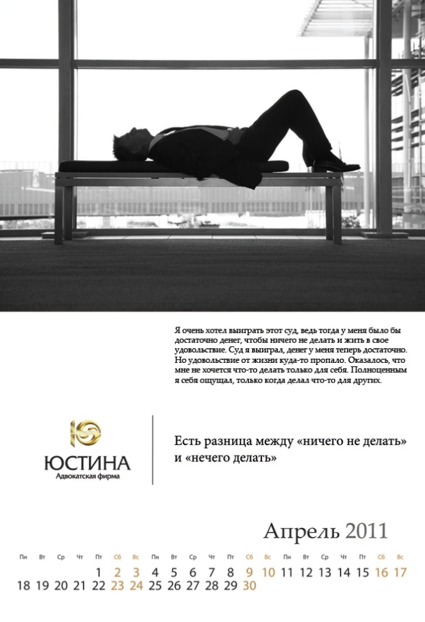 Адвокатское бюро получило философский календарьВ агентстве BrandProduction разработали календарь для компании "Юстина"Необходимо было учитывать, что основная масса клиентов и партнеров "Юстины" - это представители крупных, очень крупных и просто громадных структур. Удивить таких людей чем-то материальным весьма непросто. Поэтому было решено обращаться к эмоциям, чувствам и сердцу клиентов. Агентство решило в формате стандартного календаря рассказать несколько сюжетов, которые смогли бы тронуть душу заказчиков "Юстины". Так родился цикл жизненных историй с философскими нотками. Агентство постаралось обнажить гуманистическую подоплеку адвокатской деятельности и показать, что в любом юридическом деле главными являются не буквы закона, а живые люди. За сухими и занудными судебными формулировками стоят самые разные эмоции, мысли и чаяния людей. В итоге удалось создать необычный продукт, который даже сложно назвать рекламой "Юстины" - скорее это повод задуматься. И как показала реакция клиентов, календарь достиг своей цели. Состав творческой группы: