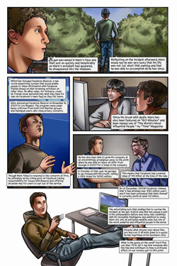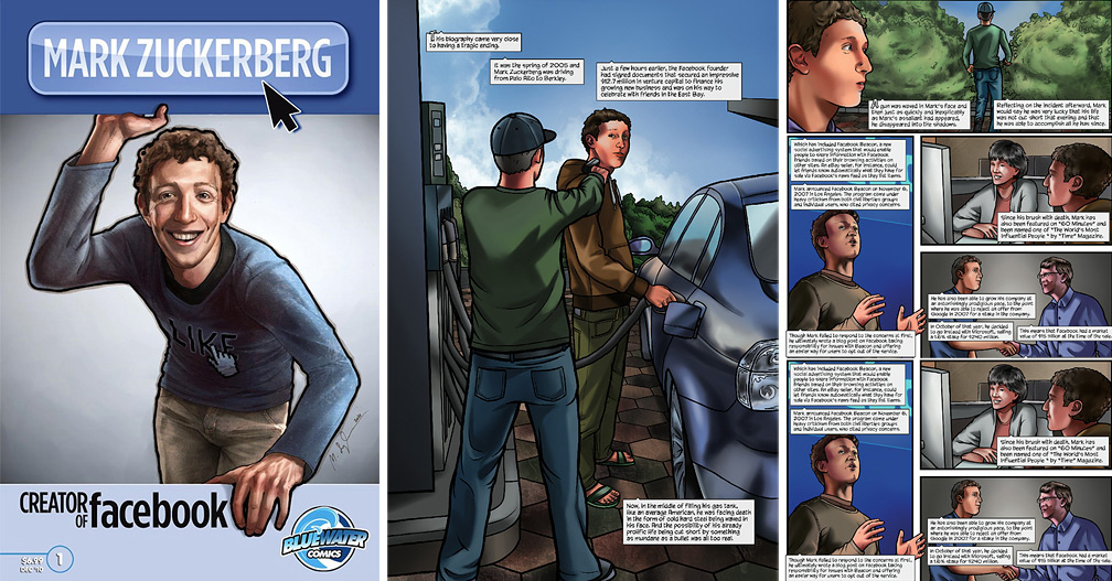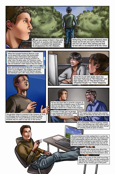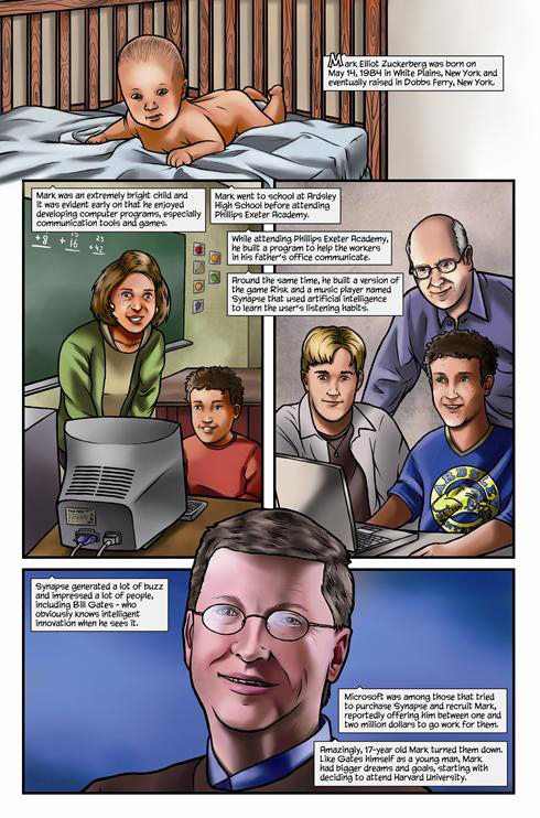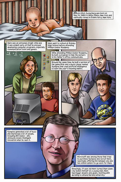 Марк Цукерберг стал комиксомСамый молодой миллиардер стал героем комикса Mark Zuckerberg: Creator of FacebookВ США 23 февраля стартовали продажи комикса Mark Zuckerberg: Creator of Facebook. Как несложно догадаться, главный герой - основатель популярной соцсети Марк Цукерберг. Издатель комикса Bluewater Productions обещает читателям "более точное и сбалансированное описание личности Цукерберга", чем в фильме "Социальная сеть". Комикс можно приобрести в книжных и интернет-магазинах, он стоит 6,99 доллара. Кто такой настоящий Марк Цукерберг? Молодой миллиардер, создатель и гендиректор Facebook, который недавно заявил, что пожертвует 100 миллионов долларов на государственные школы? Или хладнокровный бизнесмен, который получает от людей то, что он хочет, - как его изобразили в фильме "Социальная сеть". Авторы считают, что ответ где-то посередине и через иллюстрации можно об этом рассказать. 48-страничный комикс Mark Zuckerberg: Creator of Facebook создали Джером Майда (текст), Сэл Филд (иллюстрации) и Michal Szyksznian (дизайн обложки). Несмотря на довольно короткую биографию молодого человека (в мае этого года Цукербергу исполнится 27 лет), им удалось сделать вдвое больше запланированного объема. "Это интригующая история, - говорит Майда. - Я наслаждался исследованием, потому что это весьма захватывающе. Марк Цукерберг - самый молодой миллиардер планеты и создал нечто, что уже оказало сильное воздействие на мир. Но вряд ли кто-нибудь много знает о нем. Это удивительно". Автор комикса не ставил перед собой задачу описать биографию Цукерберга во всех подробностях, как это сделал Бен Мезрич в своей книге "Случайные миллиардеры". Именно она легла в основу сценария фильма "Социальная сеть". Однако автор говорит, что обнаружил немало новых интересных подробностей; например, что Цукерберг тайно проникал в комнаты студенток в общежитии Гарварда, чтобы получить фотографии девушек для своего первого проекта FaceMash (прообраза FB). Жизнь и карьера Марка Цукерберга вдохновили продюсерскую компанию Hayden 5 Media на создание сценария и мультфильма по мотивам комикса. Как говорит Тодд Уайзман, президент Hayden 5 Media: "Мы увидели прекрасную возможность после "Социальной сети" пересказать историю Марка Цукерберга в ярких, анимационных формах, которые будут доступны и понятны широкой аудитории". Напомним, что в октябре 2010 года вышел фильм "Социальная сеть" режиссера Дэвида Финчера. Он получил признание у телекритиков "Золотого глобуса", которые назвали фильм лучшей драмой 2010 года, а Финчера - лучшим режиссером. Лучшей картиной 2010 года "Социальную сеть" считает и Ассоциация кинокритиков США. Кассовые сборы фильма уже превысили 200 миллионов долларов.