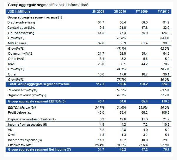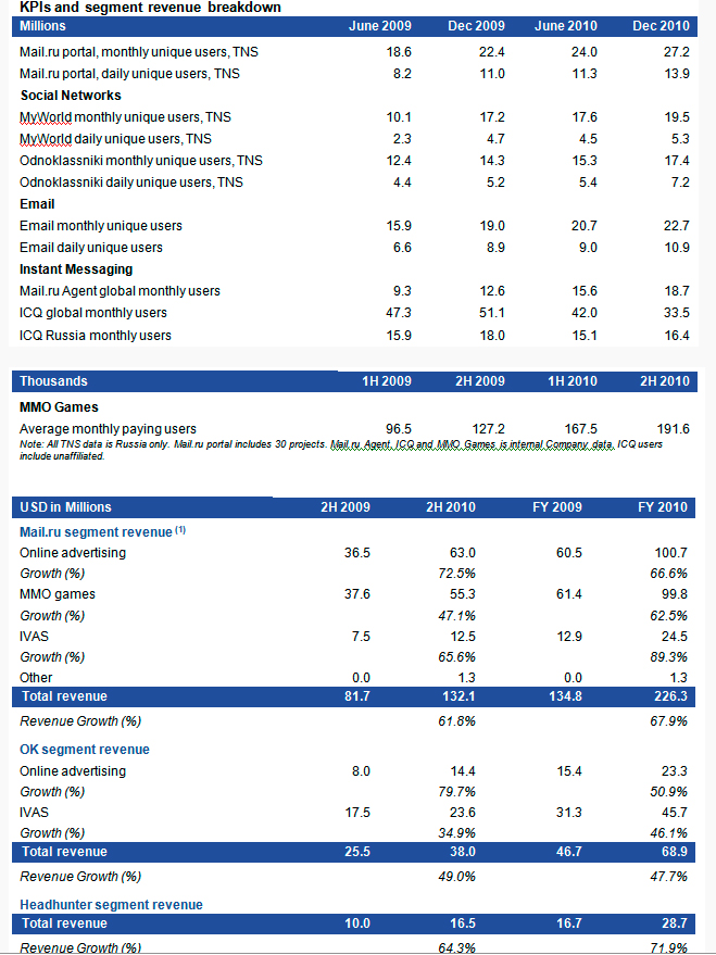 Прибыль Mail.ru Group за год выросла на 63%Крупнейший российский интернет-холдинг представил первый финансовый отчет после IPOMail.ru Group представили первый после осеннего IPO предварительный финансовый отчет о своей деятельности в 2010 году. Согласно ему чистая прибыль интернет-холдинга за отчетный период увеличилась на 63% и достигла 76,7 миллиона долларов. Общая выручка холдинга составила 324 миллиона долларов, что на 64% выше результатов 2009 года (или на 58% без учета эффекта от приобретения ICQ). EBITDA в минувшем году выросла на 78% и достигла 116,6 миллиона долларов. В декабре 2010 года среднемесячный показатель по уникальным посетителям ресурсов Mail.ru Group достиг 27,2 миллиона человек, что на 14% выше показателя июня 2010 года и 21% декабря 2009 года (данные TNS Russia, включающие мониторинг 30 продуктов холдинга). Напомним, что Mail.ru Group существует с 1998 года, однако нынешнее имя получил после покупки компании Mail.ru и масштабной консолидации активов в прошлом году. Холдинг объединяет различные сервисы Mail.ru (почтовые, поисковые, новостные, геолокационные и социальные), популярные инстант-мессенджеры ICQ и "Mail.ru@Агент", группу бизнес-проектов Head Hunter, социальные сети "Одноклассники" (100%) и "ВКонтакте" (32%), десятки игровых проектов (MMORPG, браузерные, для соцсетей), сеть платежных терминалов Qiwi. Крупнейшими акционерами Mail.ru Group являются Алишер Усманов (26,9%), основатели и менеджмент (11,8%), медиагруппы Naspers (30,8%) и Tencent Holdings Ltd (8,3%). В ноябре прошлого года холдинг вышел на IPO и заработал на размещении ценных бумаг порядка миллиарда долларов. Большая часть из вырученных средств пошла на приобретение новых активов, в частности, пакетов соцсетей "ВКонтакте" и Facebook.