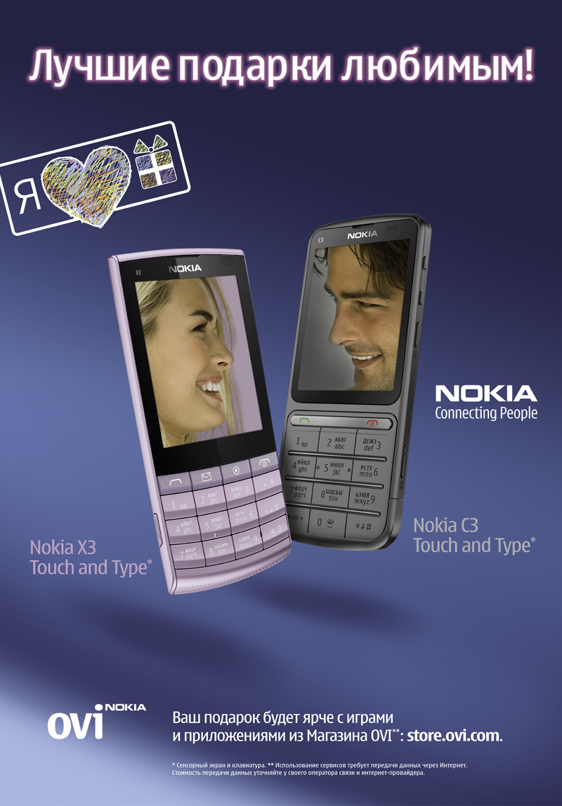 В преддверии праздников ГК "Связной" запустила рекламную кампанию "Лучшие подарки любимым!" по продвижению Nokia X3-02 и Nokia C3-01, которая продлится до 8 марта. Материалы кампании будут размещены в прессе, на телевидении и на наружных носителях.