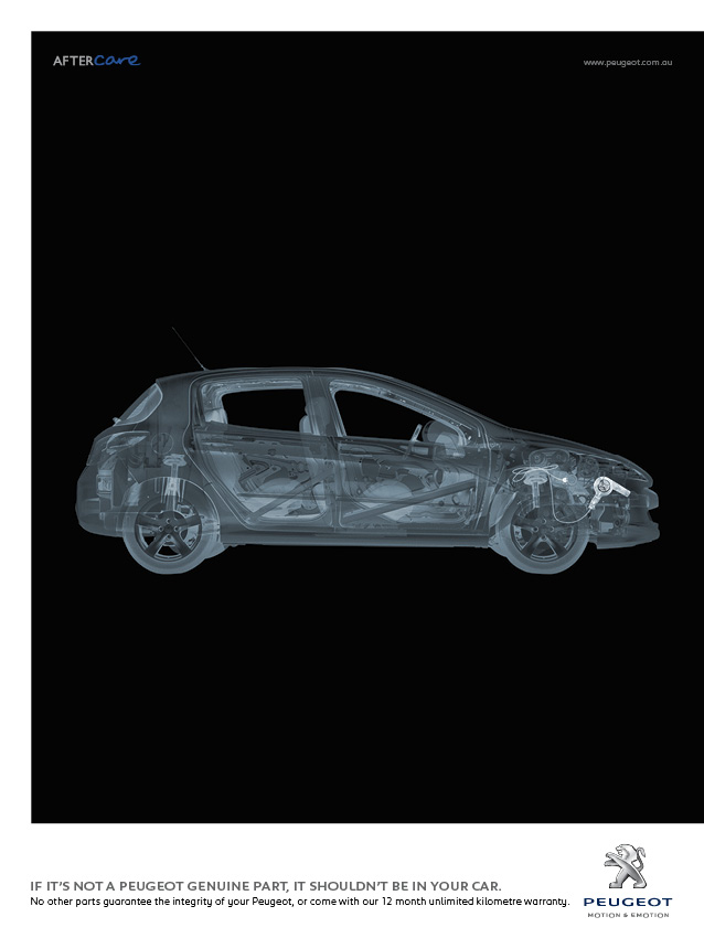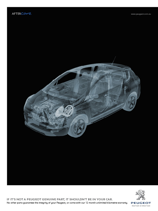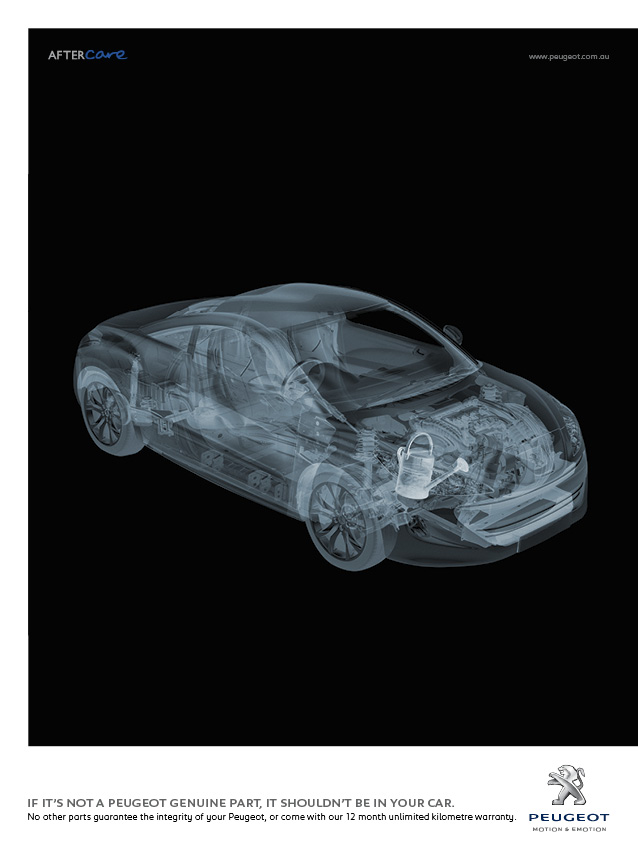 Peugeot не позволит фену стать частью вашего автоОчередная кампания о необходимости использования только оригинальных запчастейСиднейское агентство The Furnace выпустило печатную кампанию, в которой использовало рентгеновские снимки различных авто марки Peugeot. На снимках видны совершенно посторонние предметы, вроде фена, лейки или горна, которые каким-то образом попали внутрь двигателя автомобилей. Реклама посвящена необходимости использовать только детали Peugeotпри ремонте, и подчеркивает, что посторонние запчасти только портят автомобиль. В частности, авторы рекламы делают упор на то, что неоригинальные детали не гарантируют целостность автомобиля, тогда как использование запчастей Peugeot сопровождается и годовой гарантией их работы.