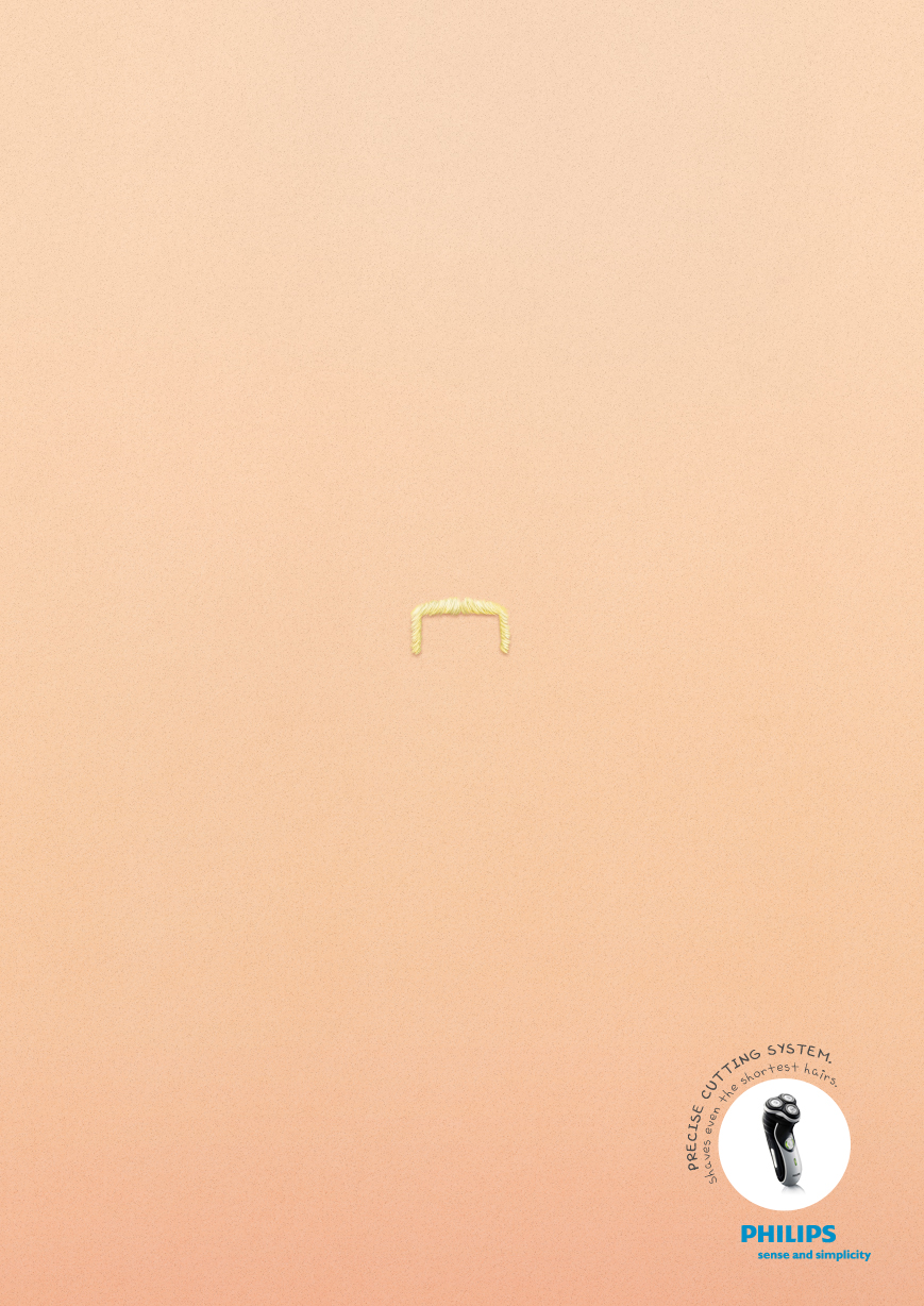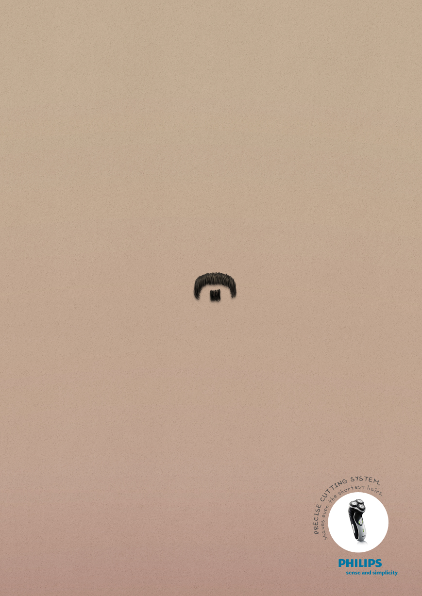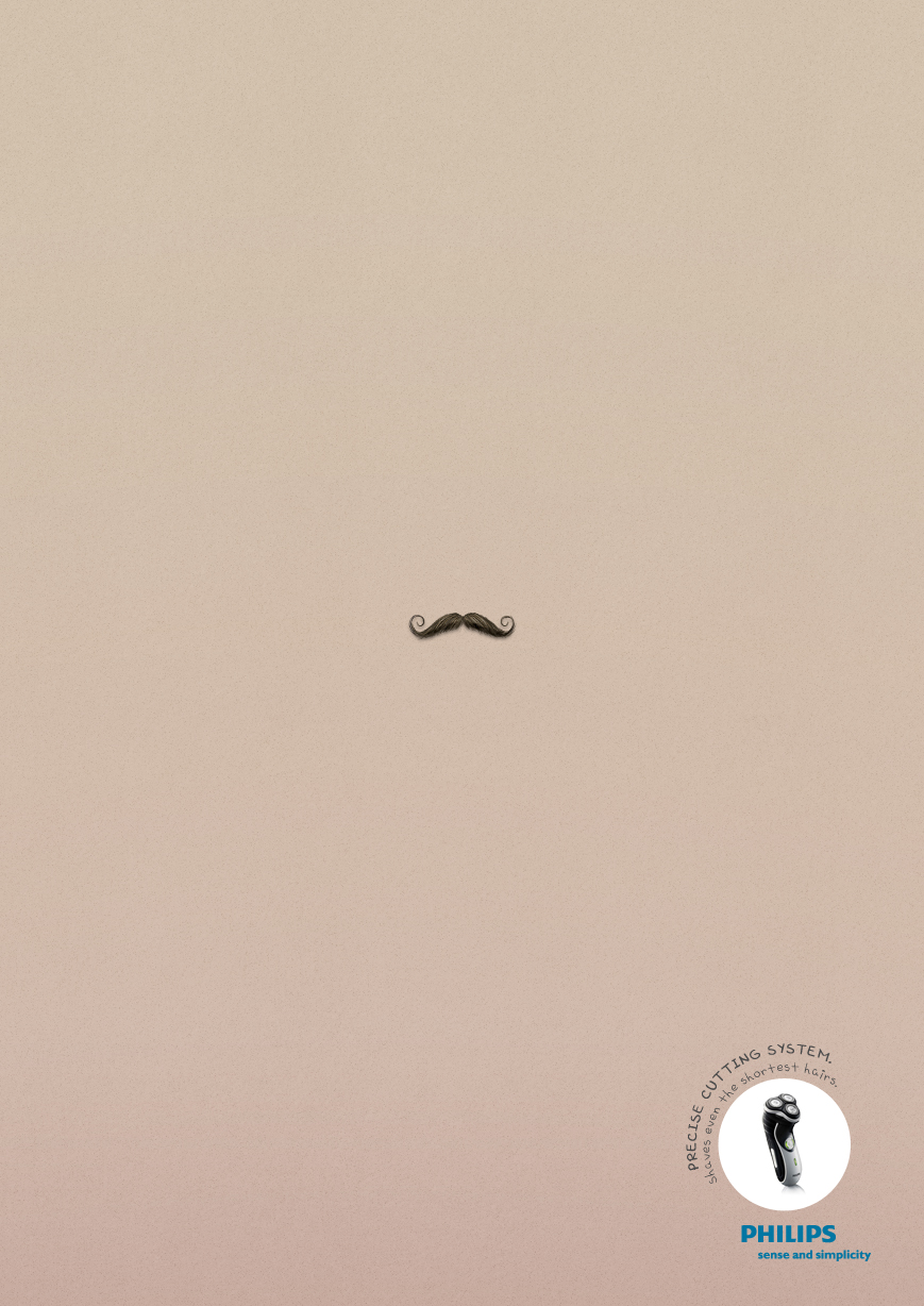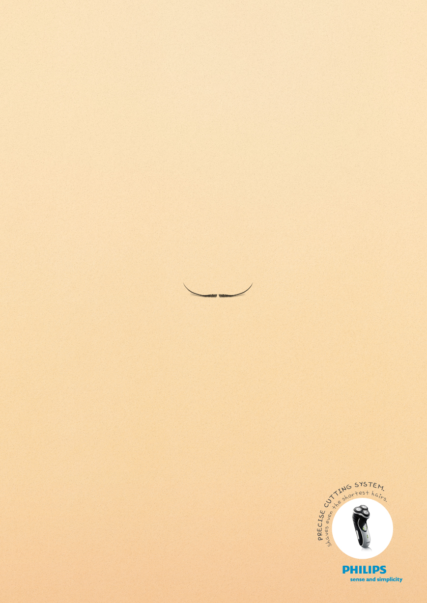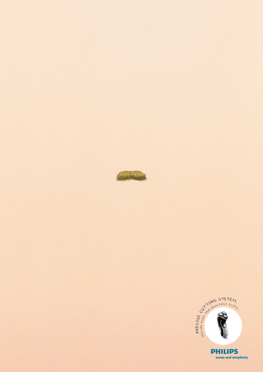 Усатая реклама бритвы PhilipsЭлементарная кампания силами одного человекаБразильский арт-директор Глаубер Доротеу в одиночку создал печатную кампанию для компании Philips. Реклама посвящена системе сверхточного бритья на электробритвах Philips, которая позволяет чисто сбривать даже самые короткие волоски и без труда придавать нужную форму усам. Серия принтов Доротеу чрезвычайно проста - на них собственно и изображены одни только усы и больше ничего. Но говорить о чрезвычайной креативности не приходится - стремление максимально упростить проект привело к тому, что он стал совершенно безликим и незаметным.