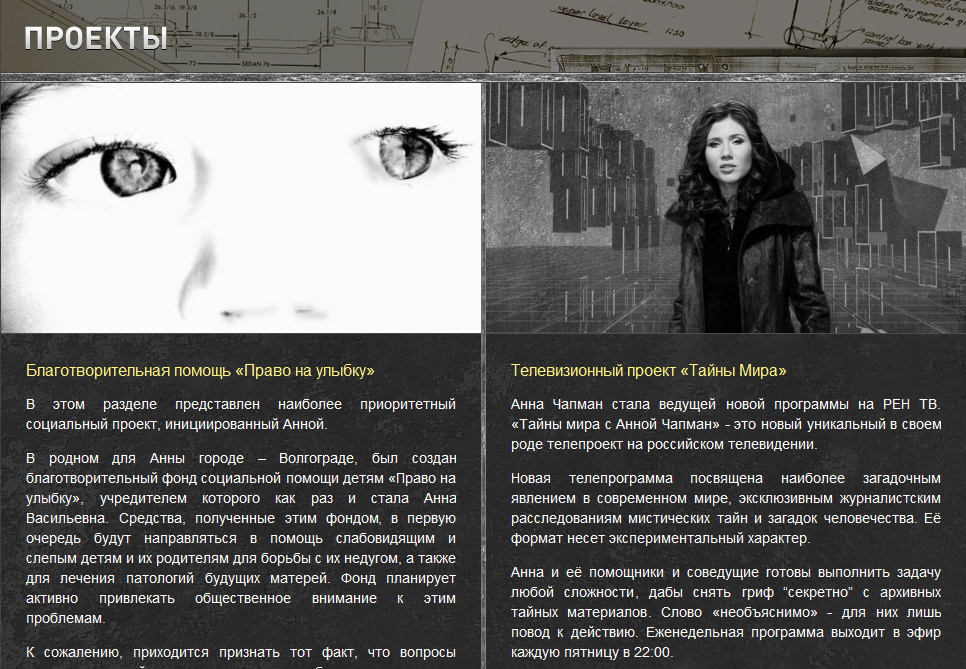 В своем обращении, опубликованном на портале, Анна пишет: "Я рада приветствовать вас на своем официальном сайте. Лучше иметь один первоисточник, чем 100 косвенных. До возвращения в Москву в июле 2010 году я стремилась к достижению собственной гармонии, была больше озадачена собственным счастьем, но со временем моя идеология поменялась, - я поняла, что полнота и осмысленность жизни постигается в отдаче, в желании и стремлении помочь людям, окружающим меня. День своего возвращения я считаю вторым днем рождения. А еще я поняла, что сила в единстве, но не только единстве внутри нашего народа, но и единства всех народов, а также народа с землей. Не говоря уже о вашем внутреннем единстве..." Напомним, что в конце января скандально известная разведчица Анна Чапман зарегистрировала в Роспатенте свое имя в качестве товарного знака. Чапман готова дать имя самым различным товарам: косметическим кремам, часам, одежде, пиву, водке и соку. Кроме того, Чапман хочет выпустить одноименную куклу. Заявка на регистрацию была подана еще в августе 2010 года. Срок действия регистрации - до августа 2020 года, но впоследствии ее можно продлить. С начала 2011 года Анна стала ведущей новой программы РЕН ТВ "Тайны мира с Анной Чапман". Программа "Тайны мира с Анной Чапман" посвящена самым загадочным явлениям современности. Создатели программы утверждают: формат этот - экспериментальный. |