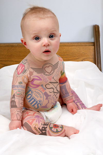 Детям набили татуировки в виде мировых брендовАвстралийский скульптор использовал младенцев в качестве планшетаПервоначальный вариант идеи с татуировками ввиде брендов художник Дитрих Вегнер воплотил на нескольких резиновых скульптурах детей. В качестве развития проекта, креатор решил проэкспериментировать с живыми малышами. К счастью, татуировки ненастоящие. Сам Вегнер называет свои фотографии "воплощением развития и формирования личности".