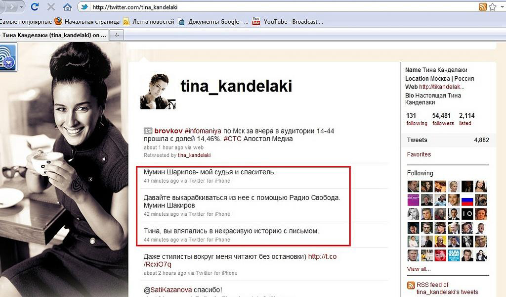 Тина Канделаки неудачно развязала войну против Радио СвободыВместо объяснения по поводу "Письма 55", телеведущая обвинила журналиста радиостанции во взломе ее Twitter-аккаунтаВокруг известной телеведущей Тины Канделаки разразился нешуточный скандал. Сначала она обвинила журналиста Радио Свобода во взломе ее аккаунта в Twitter, а затем публично извинилась. Ее оппоненты считают, что Канделаки просто не хочет комментировать свою подпись под "Письмом 55" или попросту не умеет пользоваться собственным iPhone. Напомним, Тина Канделаки является одним из подписантов письма в поддержку приговора Михаилу Ходорковскому. В связи с этим журналист Радио Свобода Мумин Шакиров попросил дать комментарий, однако так его и не получил. Через некоторое время в ЖЖ Канделаки появилась запись, обвиняющая Шакирова в том, что он взломал Twitter-аккаунт телеведущей. "Журналист Мумин Шакиров, не получив моего комментария по поводу письма, решил обратиться ко мне напрямую и взломал мой аккаунт в Твиттере. Хорошие методы работы у Мумина Шакирова и радио "Свобода". Вот так осуждая действия провластных организаций, представитель "независимой" радиостанции пошел еще дальше всеми ненавистной "ликующей гопоты". Это подсудное дело, пишу заявление в правоохранительные органы", - написала Канделаки на своей странице в LiveJournal. Мгновенно разразившийся скандал и острая реакция Радио Свобода вынудили телеведущую извиниться за поспешные выводы. "В связи с разгорающимся скандалом хотела бы принести свои извинения журналисту Мумину Шакирову за то, что поспешила обвинить его во взломе моего аккаунта в Твиттере до того, как чья-либо вина была на сто процентов доказана. В скандале участвовать не хочу, на это нет ни желания, ни времени. А в ситуации со взломом моего твиттера я буду разбираться", - сообщила Канделаки. Радио Свободы и Мумин Шакиров не намерены прощать Канделаки ее слова, тем более, что телеведущая и член Общественной палаты так и не извинилась непосредственно перед радиостанцией. "Обвинения Канделаки основаны на том, что днем в пятницу, 4 марта, в ее микроблоге появились несколько записей от лица журналиста РС, абсолютно совпадающие с приведенными выше SMS-сообщениями. Судя по всему, Канделаки сама случайно отправила SMS- сообщения в Twitter, что в общем случается с владельцами iPhone. Однако, заметим, что телеведущая публично обвинила корреспондента РС в уголовном преступлении, что, безусловно, станет предметом пристального внимания со стороны юристов РС", - прокомментировал ситуацию Мумин Шакиров. |