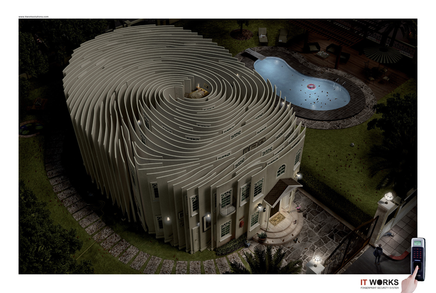 Лабиринты из отпечатков пальцевРеклама системы безопасности It WorksТаиландское рекламное агентство SpicyH выпустило серию принтов для продвижения систем безопасности It Works, анализирующих отпечатки пальцев. Рекламисты проиллюстрировали сам принцип работы системы, изобразив настоящие лабиринты, повторяющие рисунок отпечатка пальца, который, собственно, является единственным ключом к рабочему месту или дому. Креаторы сумели продемонстрировать пригодность системы как для коммерческих и государственных организаций, так и для частных клиентов, которые могут установить ее дома. Состав творческой группы |