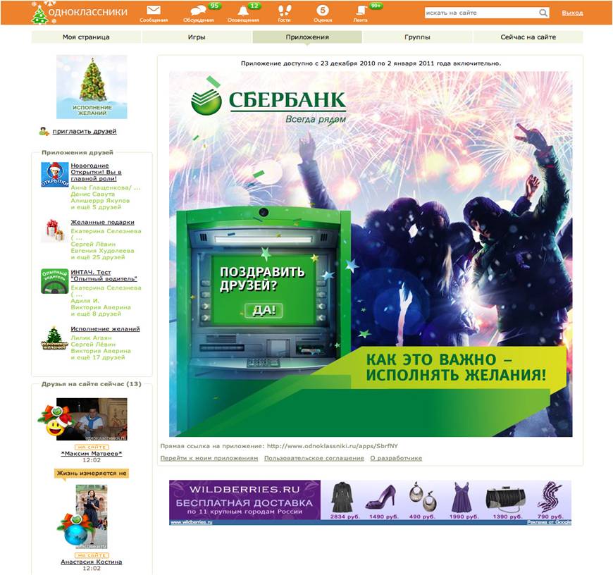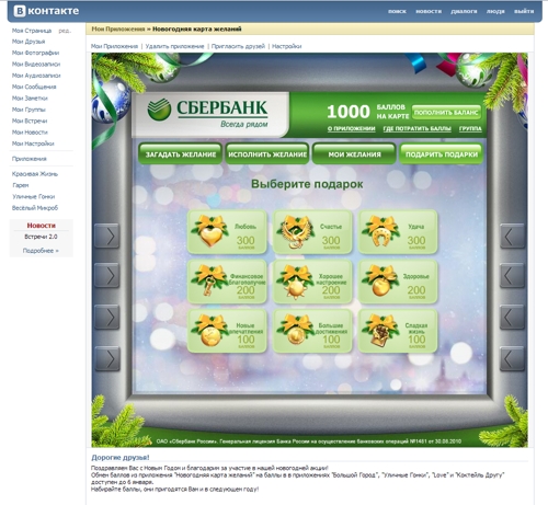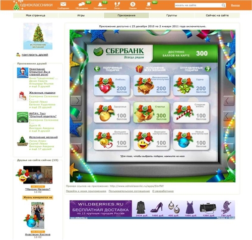 Сбербанк решил ставить рекорды через социальные сетиБанк продолжает активно использовать социальные медиа в своей рекламной кампанииАкция с новогодним виртуальным подарком-свечкой, проведенная в "Одноклассниках" в 2009 году, стала самой масштабной промокампанией за всю историю Рунета. Своей новогодней кампанией, проведенной в декабре 2010 - январе 2011, Сбербанк подтвердил рекорды массовости сразу в двух социальных сетях - "В Контакте" и "Одноклассники". Для достижения поставленных целей в рамках новогодней коммуникационной идеи "Как это важно - исполнять желания" и "Нам важно, что вам важно" было разработано приложение "Новогодняя карта желаний", позволяющее пользователям дарить друг другу виртуальные подарки, загадывать желания, исполнять желания друзей и получать за это полезные бонусы. Приложение было представлено в двух версиях - для В Контакте и для Одноклассников, которые существенно отличались друг от друга - как креативом, так и механикой. Так, в рамках акции "Новогодняя карта желаний" пользователям Odnoklassniki.ru предлагалось зайти в развлекательное приложение и отправить виртуальные подарки своим друзьям. Кампания сама по себе стала подарком для пользователей, так как существующий на Одноклассниках сервис подарков - платный, а в приложении Сбербанка все подарки были бесплатными.