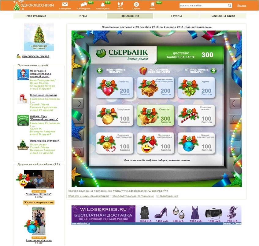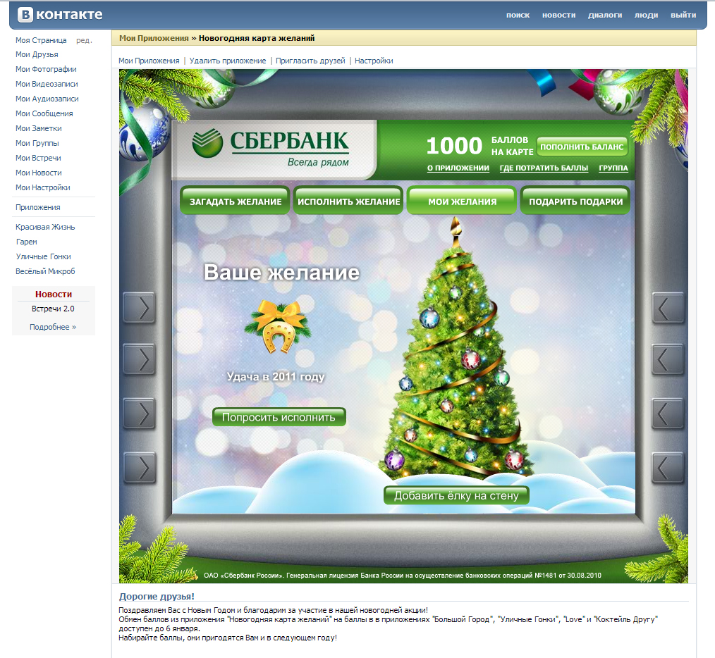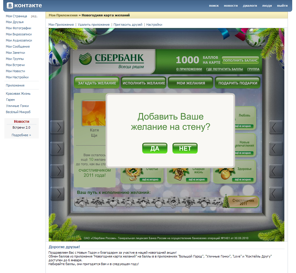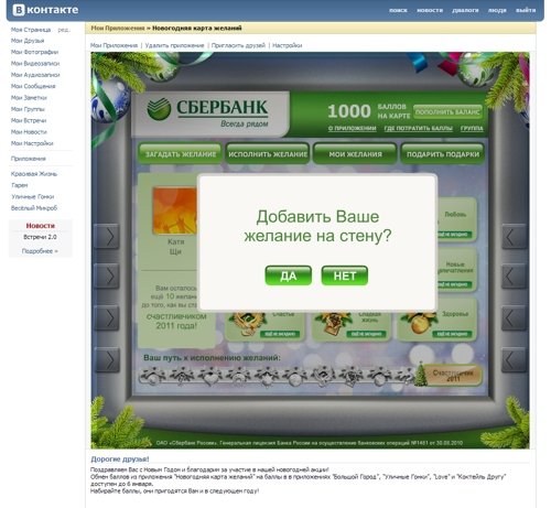Приложение В Контакте также было выполнено в форме банкомата с каточками желаний, но его функционал и креатив отличался от того, что было в Одноклассниках. Пользователям предлагалось загадать виртуальное желание и разместить его на своей стене.
