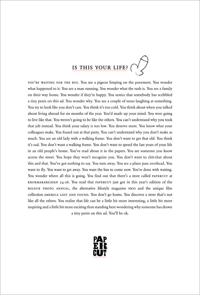 Реклама розничной сети Papercut, подготовленная креативным агентством DDB в Стокгольме, уже содержит все необходимые атрибуты «мелкого хулиганства». Но при этом заинтересовывает содержанием текста, который там опубликован.