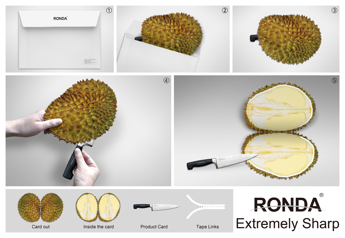 Открытки поведали об остроте ножей RondaКампания от китайского агентства Strange Idea AdПекинское рекламное агентство Strange Idea Ad разработало прямую рекламу для производителя ножей Ronda. Чтобы продемонстрировать высокое качество и остроту ножей этой марки, рекламисты создали серию специальных рекламных открыток. Внутри конверта располагается раскрывающая карточка, изображающая собой что-то из продуктов постоянного потребления. А в "продуктовую" открытку вложена картонная модель ножа Ronda, которой нужно "разрезать" первую карточку, прежде чем ее раскрыть. Поскольку изображения сделаны с максимальной детальностью и четкостью, потребители легко соотнесут рекламу с настоящими ножами и многим из них захочется проверить ножи Rondaв деле. Состав творческой группы |