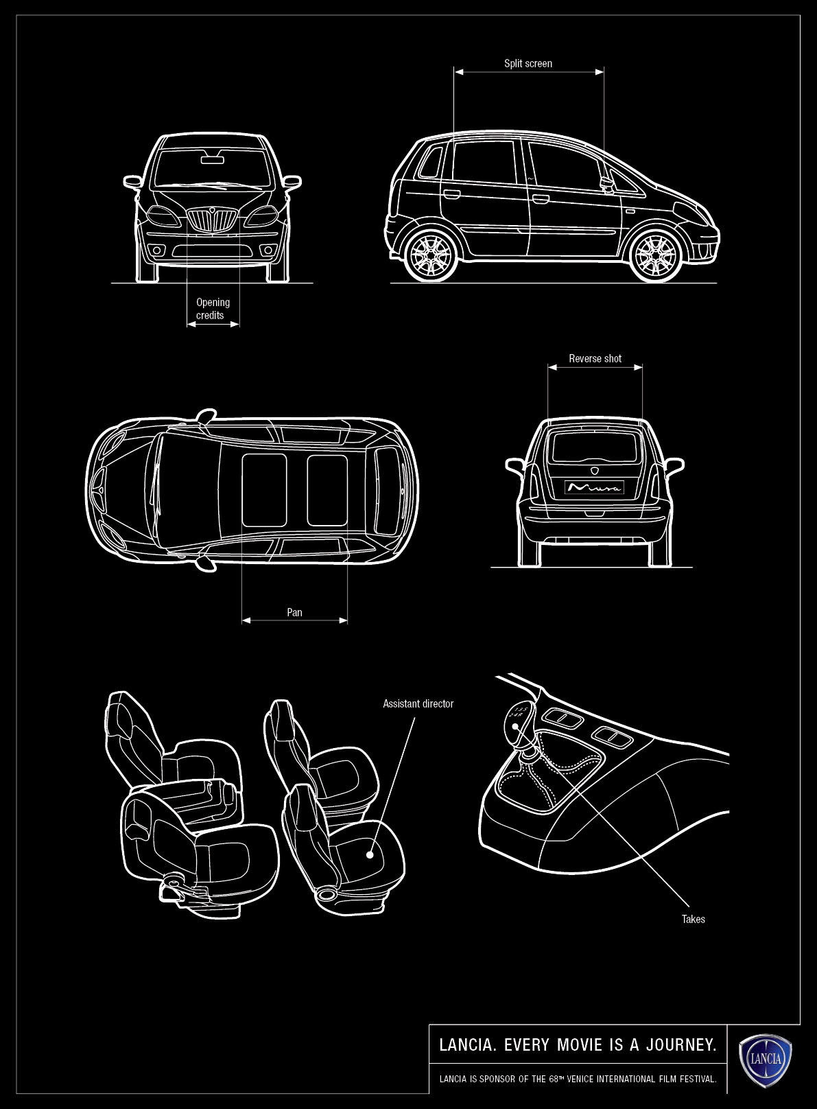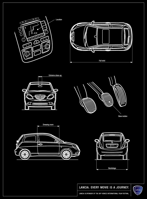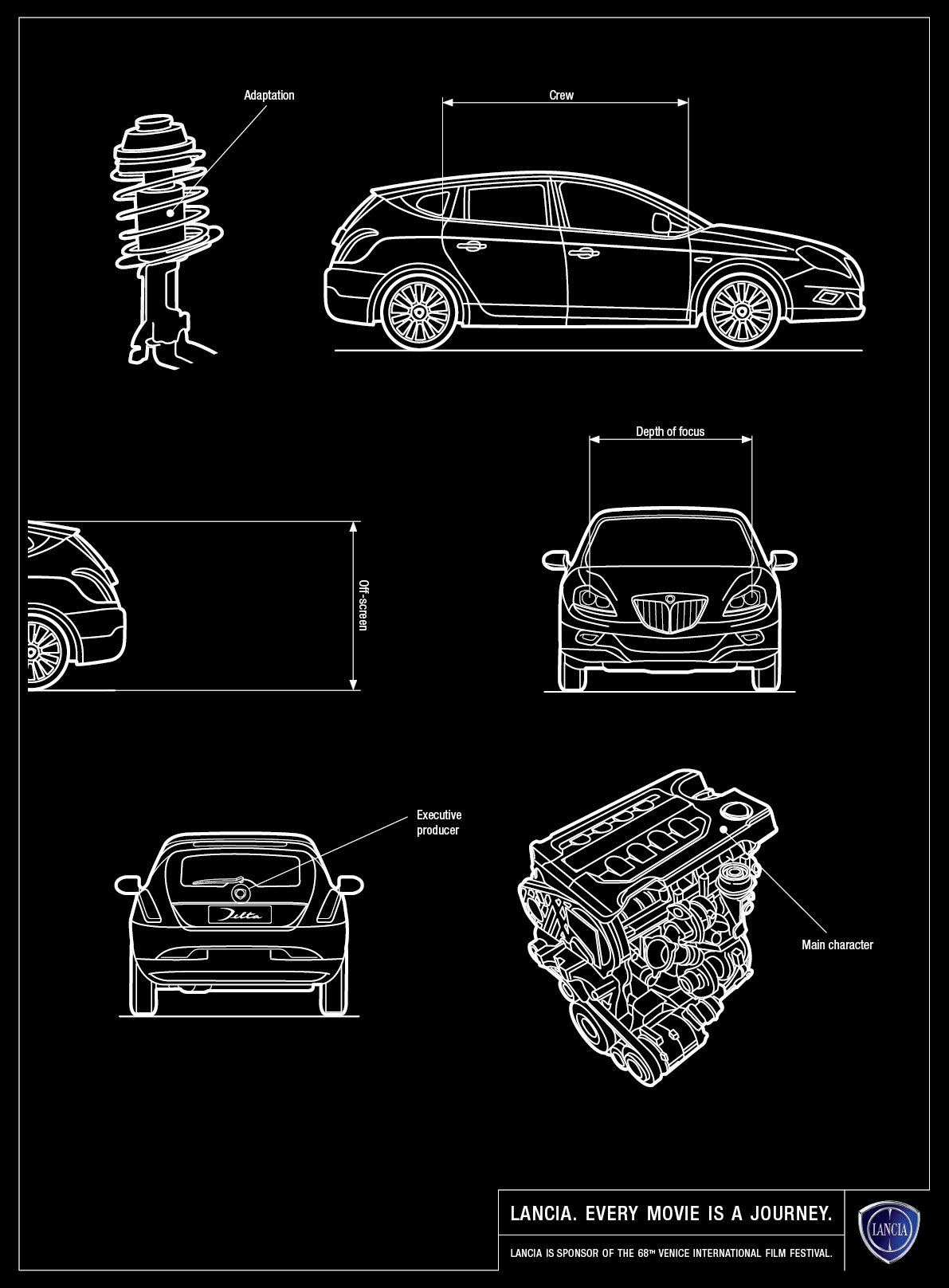 Автомобиль сравнили с киноРекламная кампания Lancia, приуроченная к Венецианскому кинофестивалюАгентство Armando Testa из итальянского Турина выпустило рекламную кампанию для автомобилей Lancia. Отличительной особенностью этого проекта является то, что реклама заодно продвигает и 68 Венецианский кинофестиваль, который пройдет в конце лета - начале осени, и спонсором которого выступает автопроизводитель. Креаторы схематично изобразили несколько моделей Lancia, описав их с помощью кинематографических терминов. Так двигатель стал главным героем, лого марки - исполнительным продюсером, переднее пассажирское сиденье обозначено как ассистент режиссера, а решетка радиатора как начальные титры. Слоган рекламы подчеркивает связь кинематографа и передвижений на автомобиле: "Каждый фильм - это путешествие". Состав творческой группы |