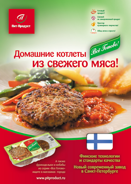 Знаменитая финская полька стала главным мотивом рекламы полуфабрикатов"Пит-Продукт" продвигает новую линейку продукции "Всё готово!"С 21 марта по 30 апреля 2011 года компания "Пит-Продукт" проводит программу маркетинговой поддержки новой линейки готовых мясных продуктов "Всё готово!", включающую различные ATL и BTL-мероприятия. Творческая идея принадлежит отделу маркетинга. Цели программы маркетинговой поддержки - увеличение продаж новой продуктовой линейки, инициирование пробной покупки и привлечение новых покупателей, убеждение в высоком качестве готовых мясных продуктов и удобстве их потребления. С 1 апреля в вагонах всех линий Петербургского метрополитена появятся рекламные плакаты формата А3, которые подчеркнут такие свойства новых готовых мясных продуктов, как их свежесть, соответствие высоким стандартам качества, финские технологии производства, удобство потребления и быстроту приготовления. На радиостанциях "Европа Плюс", "Юмор FM", "Эльдорадио", "Авторадио", "Ретро FM" будут транслироваться ролики (20 и 30 секундные джинглы), в которых также обозначены основные преимущества готовых мясных продуктов. BTL-поддержка новой линейки продукции "Всё готово!" осуществляется в крупных торговых сетях - "Лента", "О'Кей", Prisma, "Карусель", "Перекрёсток". Она включает в себя размещение рекламных модулей в каталогах продукции магазинов, шелфбаннеров на полках и напольных стикеров, распространение рекламных листовок. Кроме того, компания "Пит-Продукт" и производитель кетчупов "Балтимор" (ООО "Юнилевер Русь") проводит совместную промо-акцию. Два известных петербургских бренда объединились, чтобы предложить покупателям промо-набор: котлеты "Классические" из линейки готовых мясных продуктов "Всё готово!" и в подарок к ним кетчуп "Балтимор Адмирал" (в упаковке 240 гр.). ![]() ![]() |