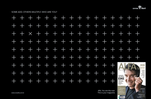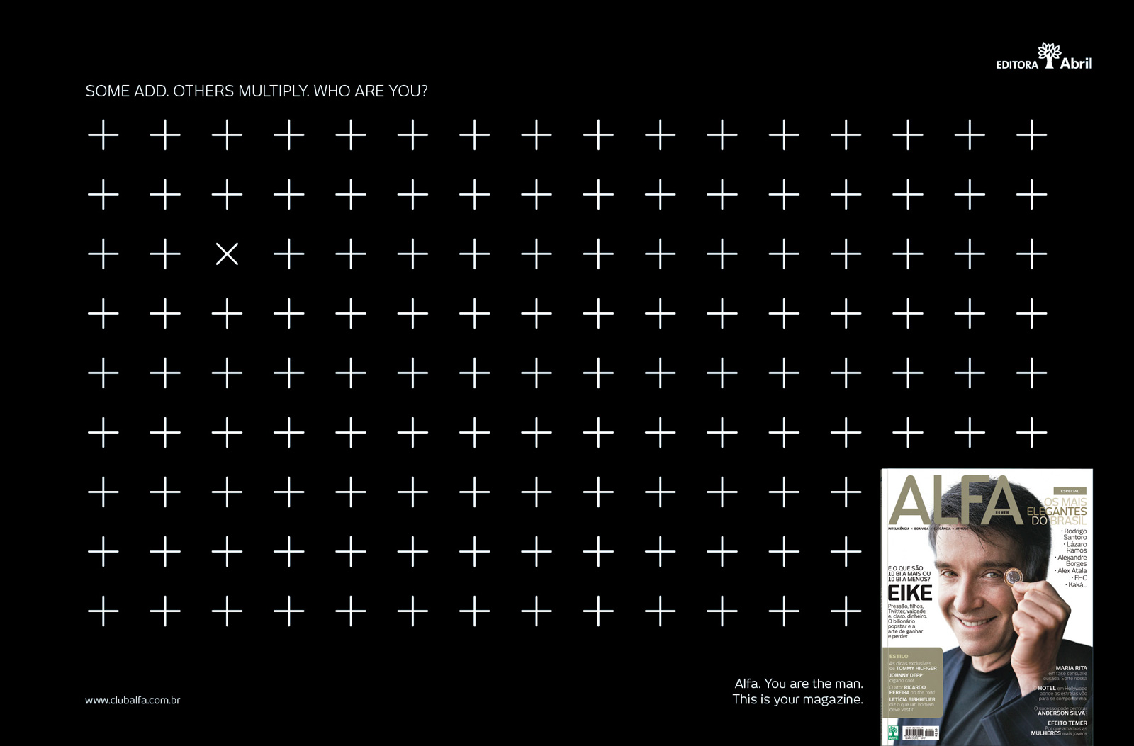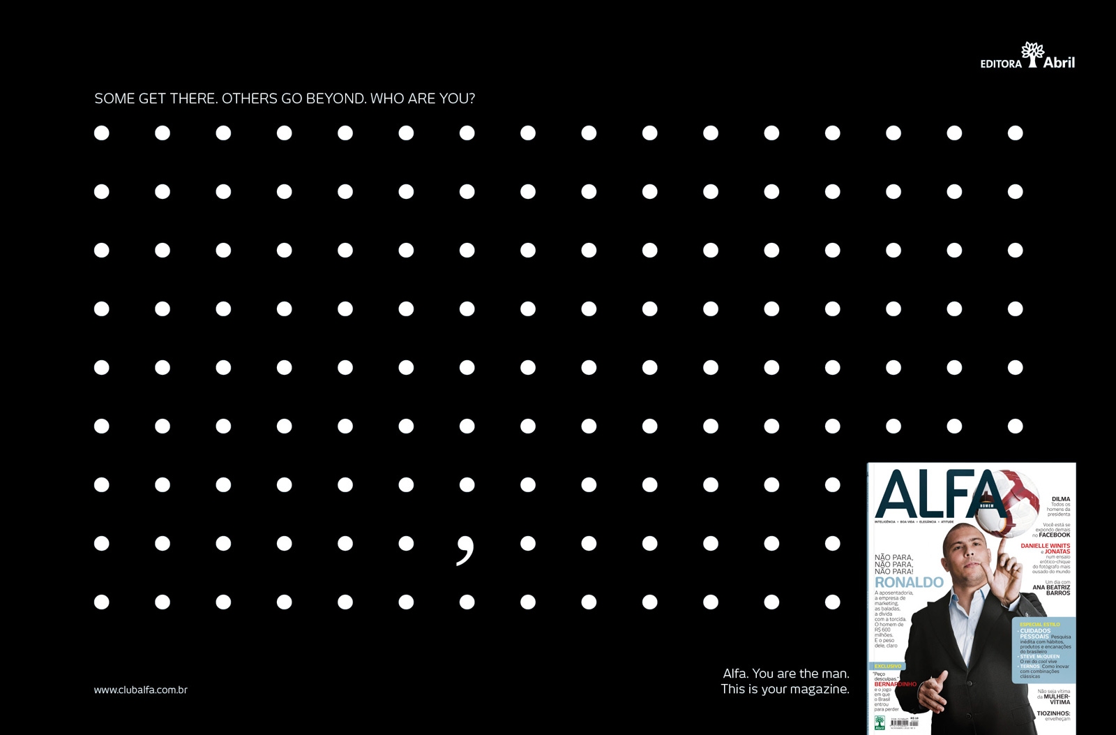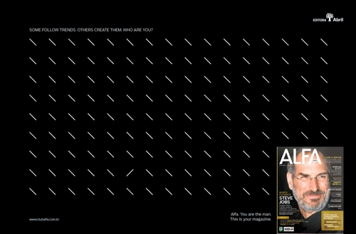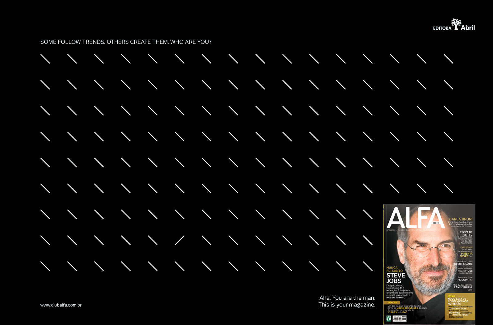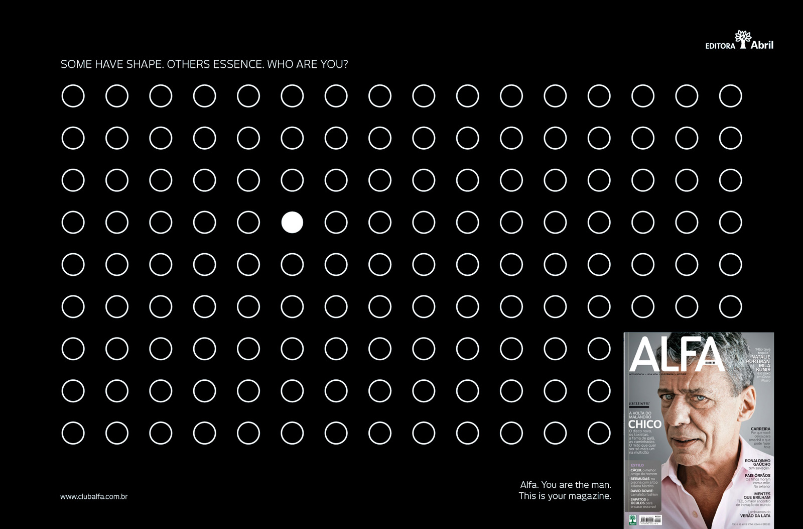 Агентство Mood из Сан-Паулу представило серию принтов, созданных для рекламы мужского журнала Alfa. Каждый из них задает зрителю вопрос о том, кем он является в этой жизни - одним из самых обыкновенных людей или же кем-то незаурядным вроде Стива Джобса или Рональдо. На принтах схематично изображена исключительность некоторых людей, а журнал в свою очередь обещает каждому шанс оказаться среди них.