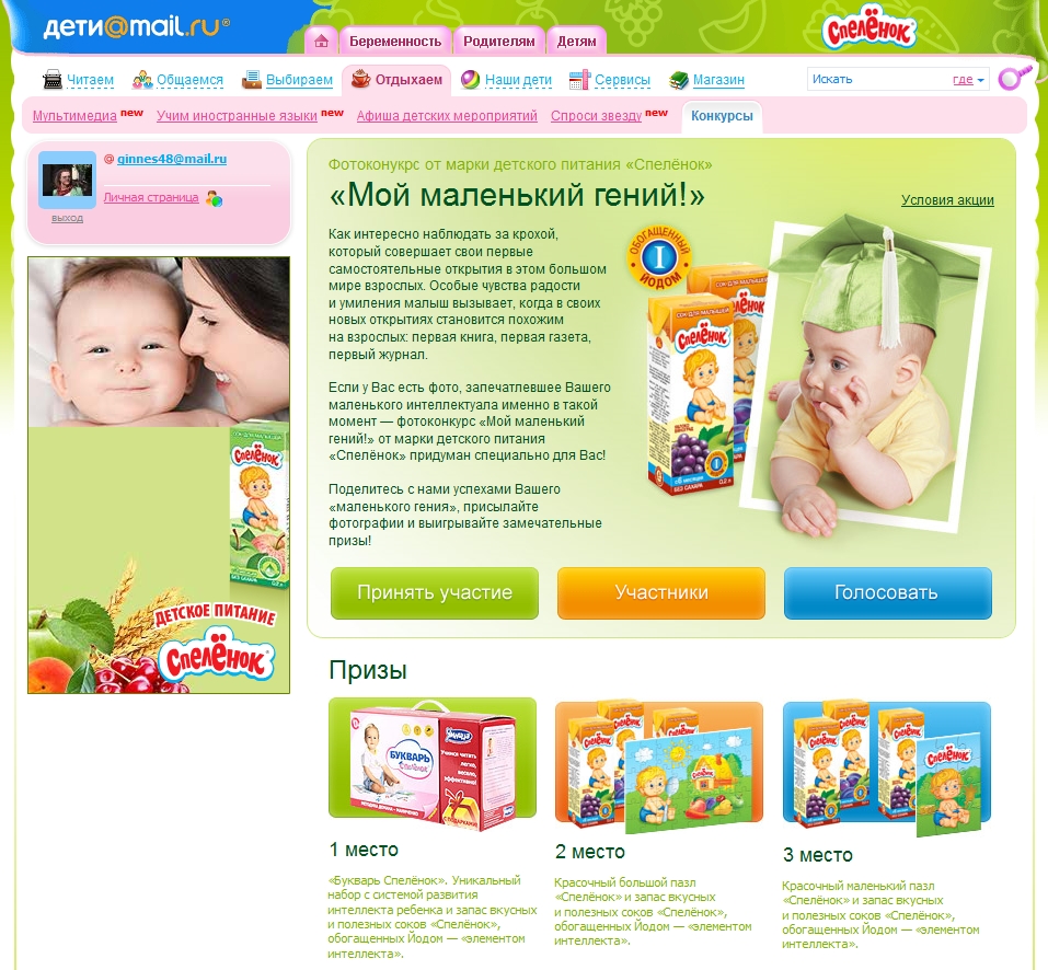 «Спелёнок» продолжает охватывать интернетАгентство "Таргет-медиа" в марте запустило специальный проект для марки детского питания "Спелёнок" на сайте Deti.Mail.ru - самом посещаемом в РФ портале, посвященном материнству и детству.Напомним, что разработка логотипа и дизайн упаковки для бренда "Спеленок" были выполнены брендинговым агентством Depot WPF. Спецпроект находится в отдельном разделе, выполненном в стилистике бренда и в его фирменных цветах. Раздел имеет приятный дизайн и посвящён проведению фотоконкурса "Мой маленький гений!". Суть конкурса предельно проста: поделиться с другими мамами фотографиями своего малыша в моменты его активного познавания мира и получить удовольствие от взаимного просмотра фоторабот. Три победителя по итогам голосования получают призы от бренда "Спелёнок". "Спецпроект ориентирован только на конкурс. Главной целью мы ставили организовать пространство для отдыха и любования детьми, - рассказывает руководитель отдела прессы и PR "Таргет-медиа" Оксана Зайцева - конечно, мы разместили также медийный баннер и каждый желающий может перейти на официальный сайт Spelenok.com и ближе ознакомиться с самой маркой и ассортиментом товара. Таким образом, мы старались избежать традиционного перенасыщения в рамках одного спецпроекта"Нельзя забывать о том, что этот конкурс входит в специальную программу нестандартного продвижения бренда "Спеленок". В феврале уже успешно прошел интерактивный проект на сайте Няня.ру, а в течение года запланировано еще немало активностей на других профильных сайтах. Напомним, недавно агентства PHD и Digital BBDO создали спецпроект бренда "Спелёнок" на сайте Baby.ru, где молодые мамы могут получать консультации специалистов по развитию и вскармливанию малышей, участвовать в фотоконкурсах, а также вступить в интерактивный клуб "Счастливая мама - здоровый ребенок". |