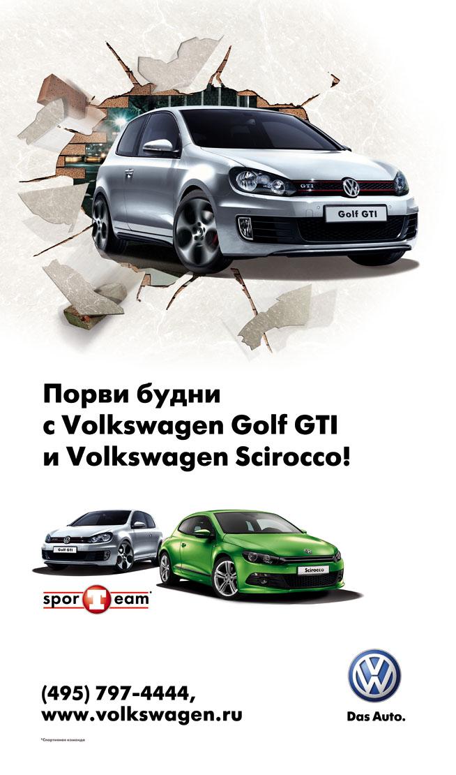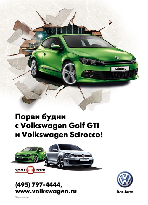 3D-реклама Volkswagen появилась в бизнес-центрахВ марте Volkswagen инициировал масштабную рекламную кампанию в бизнес-центрах с применением 3D-технологий. Размещение рекламы и производство трехмерных изображений обеспечил национальный оператор indoor-рекламы Advance Group. Цель рекламной кампании - продвижение спортивных моделей Volkswagen Golf GTI и Volkswagen Scirocco. Изюминкой кампании является 3D-технология нанесения изображения на поверхность классического лайтбокса. Объемное трехмерное изображение достигается с помощью печати по специальному пластику на широкоформатном плоттере с ультрафиолетовым излучением. Эта технология позволяет продукту выделиться в атмосфере бизнес-центров более реальным "объемным" присутствием. На одном из макетов в качестве флагмана рекламной кампании представлен Volkswagen Scirocco, врывающийся в будни бизнес-центра экспрессивным дизайном и весенне-яркой окраской. На другом макете на первый план выведена модель Volkswagen Golf GTI. В рекламной кампании задействовано порядка 100 бизнес-центров класса А/А+ и Б+, расположенных в Москве и Санкт-Петербурге. Среди них таких объекты, как "Крылатские Холмы", "Башня Федерация", "Новинский Пассаж", "Капитал Тауэр", "Берлинский Дом" и Four Winds Plaza.