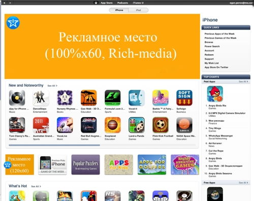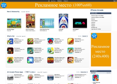 App Store начинает размещать рекламуПервым селлером интернет-магазина стало российское агентство Media starsАгентство интернет-рекламы Media stars получило эксклюзивные права на продажу медийной рекламы в App store, разделе онлайн-магазина iTunes Store, продающего обладателям продукции Apple различные приложения. Компания Apple давно планировала сделать App store еще и рекламной площадкой и выбрала Россию для пилотного запуска этого проекта. Представители российского агентства считают, что App store обладает всеми возможностями для рекламы, в первую очередь, широким охватом аудитории и возможностями для таргетинга. В рамках данного проекта будет возможно размещать рекламу не только существующих приложений магазина, но также товары и услуги локальных и глобальных брендов с максимально точной направленностью на различные группы пользователей. Основными рекламными форматами станут баннеры, перетяжки и текстово-графические блоки. Дополнительной возможностью станет отслеживание эффективности рекламной кампании в режиме реального времени. Данная опция будет доступна для рекламодателей с 4 апреля, а статистика будет предоставляться через аккаунт в App Store в разделе iAD. Кроме того, всем рекламодателям, заказавшим размещение рекламы на App store более чем на 1 миллион рублей, агентство Media stars подарит новый Ipad2 с установленным приложением просмотра статистики в режиме реального времени. Также первому клиенту будет предоставлена скидка 70%. Картинки снизу