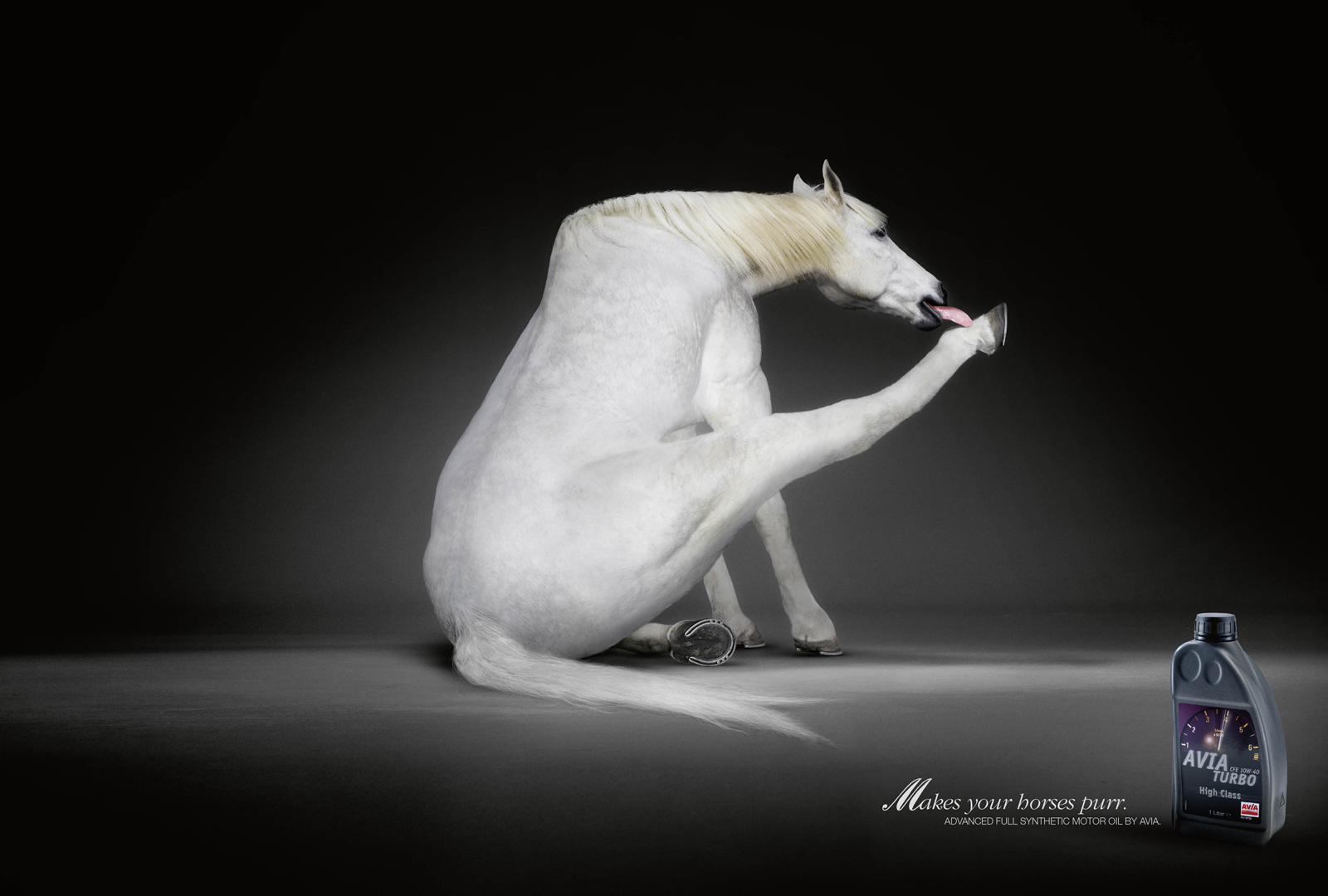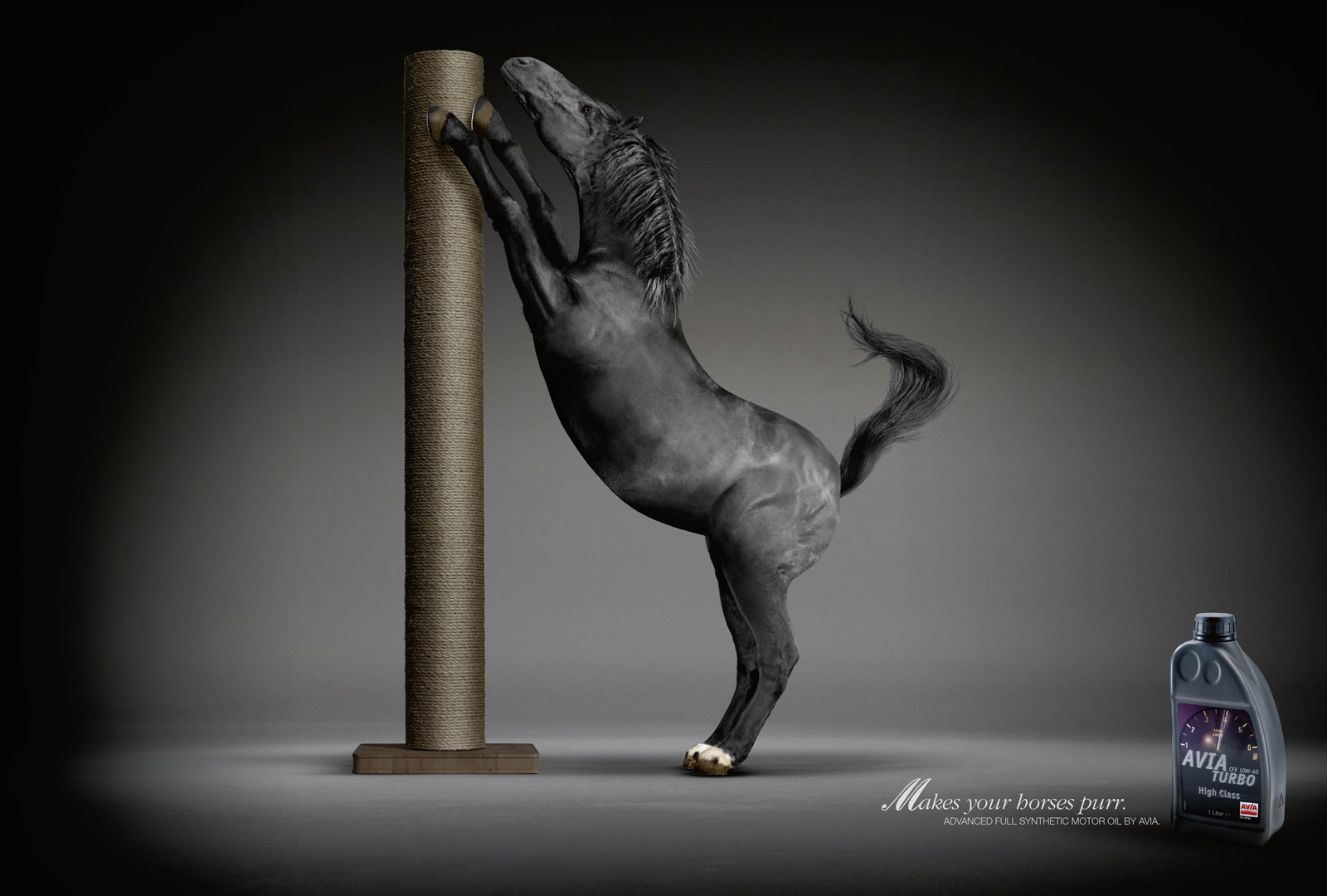 Машинное масло превратило лошадей в котятГениальная реклама масла Avia TurboМюнхенское агентство Serviceplan создало поистине гениальную кампанию для машинного масла Avia Turbo. Представляя продукт, креаторы использовали чрезвычайно яркий, смешной и при этом точный образ. Чтобы передать, что при использовании масла Avia двигатель станет работать ровно и будет отличаться мягким звучанием, они решили аллегорически продемонстрировать это с помощью лошадей, которые, понятное дело, соотносятся с лошадиными силами мотора. Придумав слоган "Пусть ваши лошади мурлычат", рекламисты изобразили несколько шикарных лошадей, которые ведут себя как кошки - умываются, "точат когти" и даже играют с клубком. Ярче представить подобный продукт, кажется, просто невозможно.