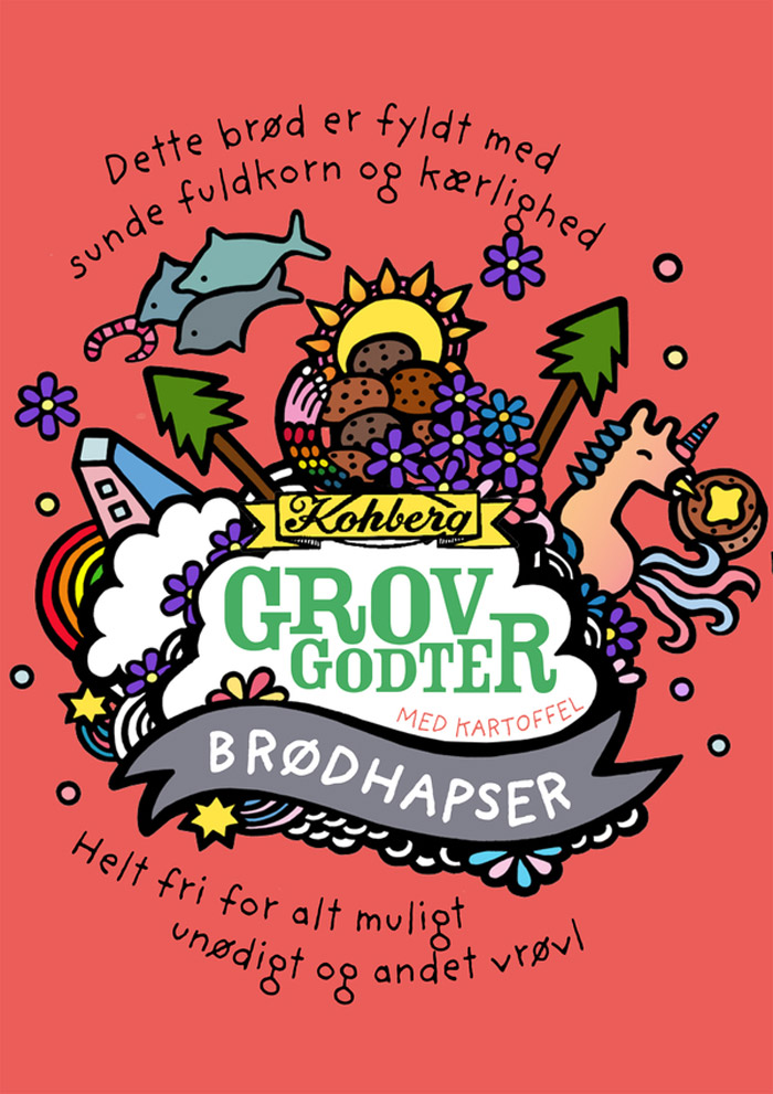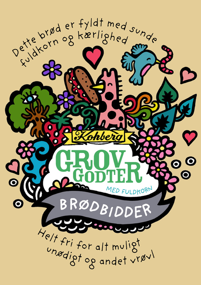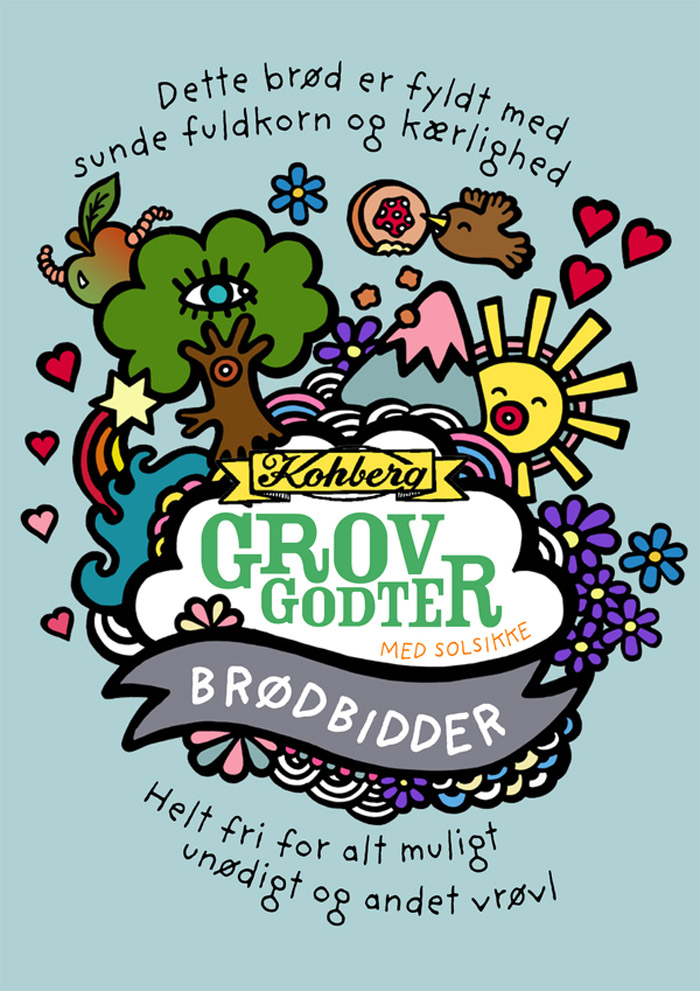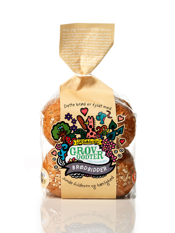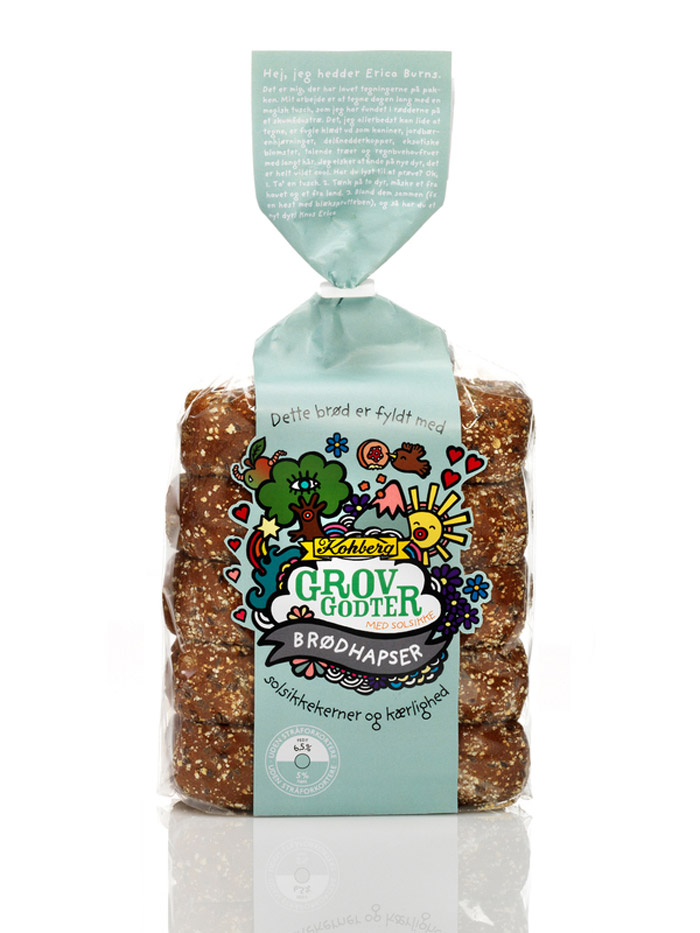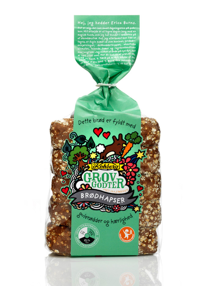 Независимый иллюстратор и дизайнер Эри Бернс разработал дизайн упаковки для популярного в Дании хлеба Kohburg. Он предложил совершено необычное, и даже сюрреалистичное решение для оформления пакетов, в которые упакован хлеб. Его дизайн отличается яркими и странными мультипликационными образами, которые, в общем-то, мало отношения имею непосредственно к продукту.