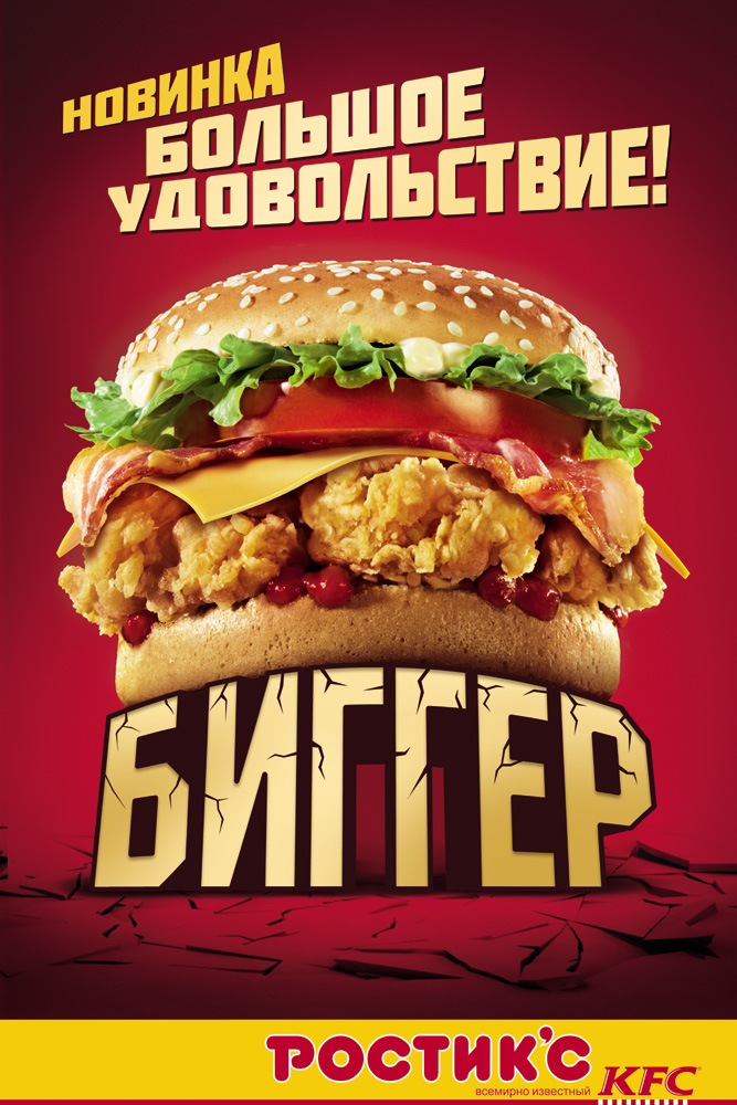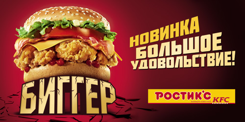 Размер имеет значение: кампания нового продукта РОСТИК'С- KFCРОСТИК'С- KFC расширила линейку сандвичей и представила новый продукт - Биггер. Биггер позиционируется как продукт для тех, кто любит жить активно, на пике эмоций и хорошего настроения, при этом хочет питаться вкусно и сытно. По мнению маркетлогов, он понравится молодым и динамичным жителям современного города, преимущественно мужчинам. Рекламная кампания в поддержку сандвича стартовала 29 марта – т.е. раньше, чем кампания в поддержку «Чикен бекона», несколько похожего на Биггер продукта Mcdonald’s. В рамках кампании по продвижению, рассчитанной на 3 месяца, используется комплекс маркетинговых инструментов, направленных на привлечение посетителей в рестораны сети и знакомство с новым продуктом. В том числе, поддержка внутри ресторана (слайды в меню, плакаты, салфетки на подносах и брендированная униформа кассиров).
