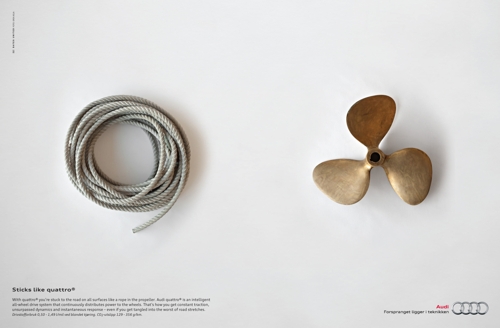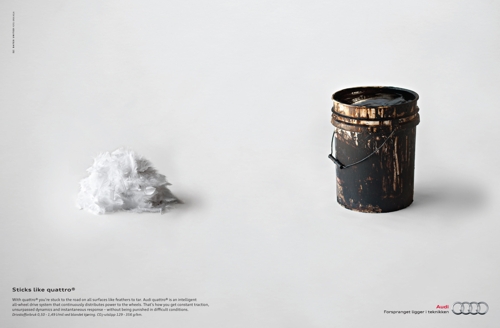 Audi quattro буквально прилипает к дорогеРекламные метафоры подчеркивают насколько хорошо полноприводная Audi держит дорогуНорвежское агентство Bates United создало новую кампанию для Audi quattro,использовав несколько довольно ярких метафор. Основная идея заключалась в том, чтобы показать потребителям, насколько хорошо автомобили Audi,оснащенные полноприводной системой quattro,хорошо держат дорогу. Для этого рекламисты решили сравнить это качество со жвачкой в волосах, веревкой в вентиляторе и перьями в смоле. Несмотря на то, что все это имеет несколько негативные ассоциации, кампания вполне удачно подчеркивает устойчивость Audi quattro. Состав творческой группы |