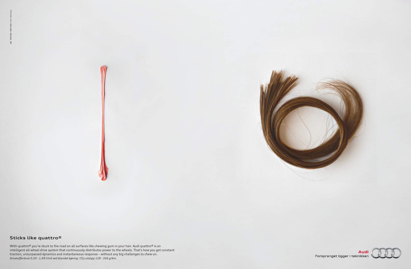 Audi quattro буквально прилипает к дорогеРекламные метафоры подчеркивают насколько хорошо полноприводная Audi держит дорогуНорвежское агентство Bates United создало новую кампанию для Audi quattro,использовав несколько довольно ярких метафор. Основная идея заключалась в том, чтобы показать потребителям, насколько хорошо автомобили Audi,оснащенные полноприводной системой quattro,хорошо держат дорогу. Для этого рекламисты решили сравнить это качество со жвачкой в волосах, веревкой в вентиляторе и перьями в смоле. Несмотря на то, что все это имеет несколько негативные ассоциации, кампания вполне удачно подчеркивает устойчивость Audi quattro. Состав творческой группы |